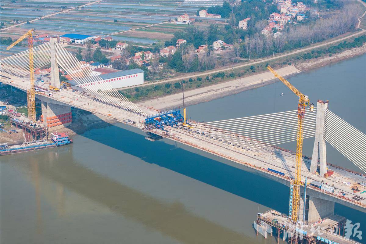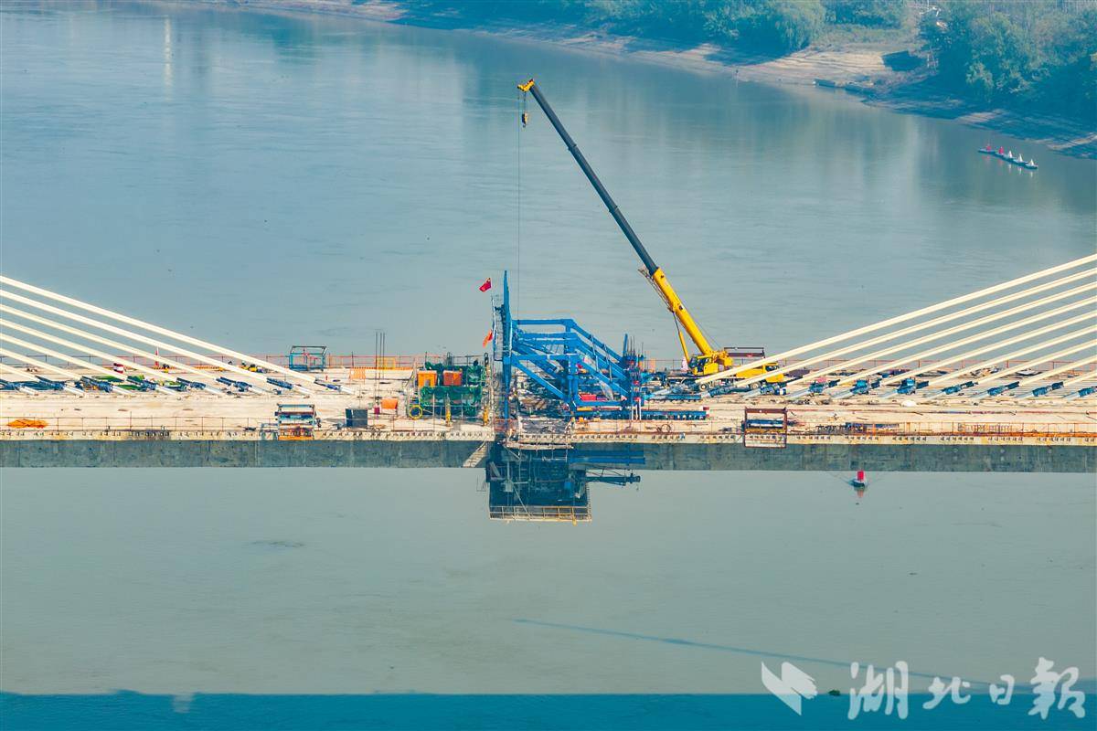 2025年11月5日,在汉川武天高速汉江特大桥施工现场,工人们正在加紧施工,本月内桥面将实现合龙。据介绍,汉川马口汉江特大桥是武天高速(武汉至重庆高速公路武汉至汉川段)的控制性工程,全长570米。武天高速公路项目是武汉至重庆高速公路的重要组成部分,预计将于2025年底建成,武汉至天门从原来的2小时减至1小时。项目建成后对孝感、天门加快融入武汉都市圈一体化进程,带动沿线经济发展具有十分重要的意义。(湖北日报全媒记者 倪娜 通讯员 尹青 摄)