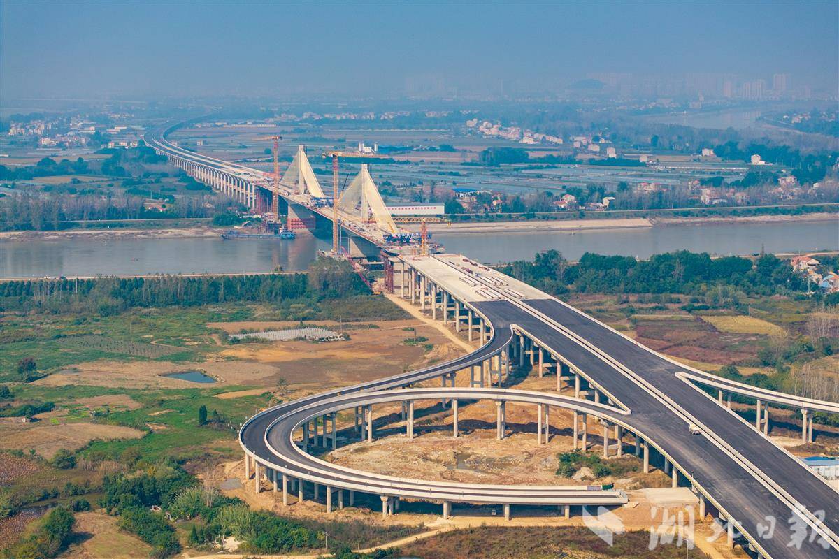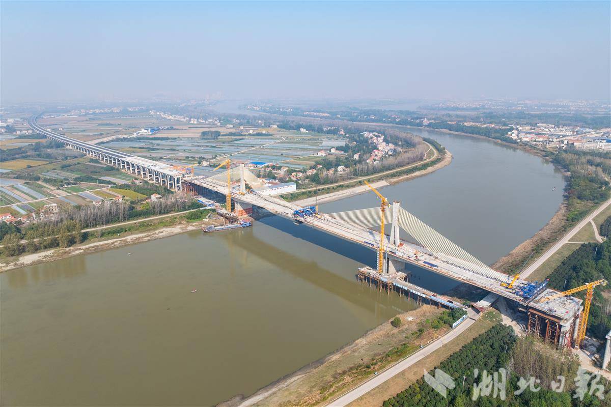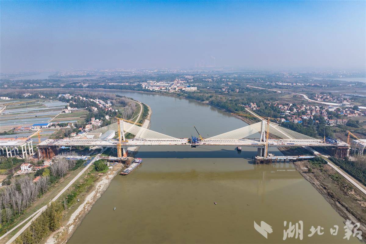 图为空中航拍即将合龙的汉川马口汉江特大桥。