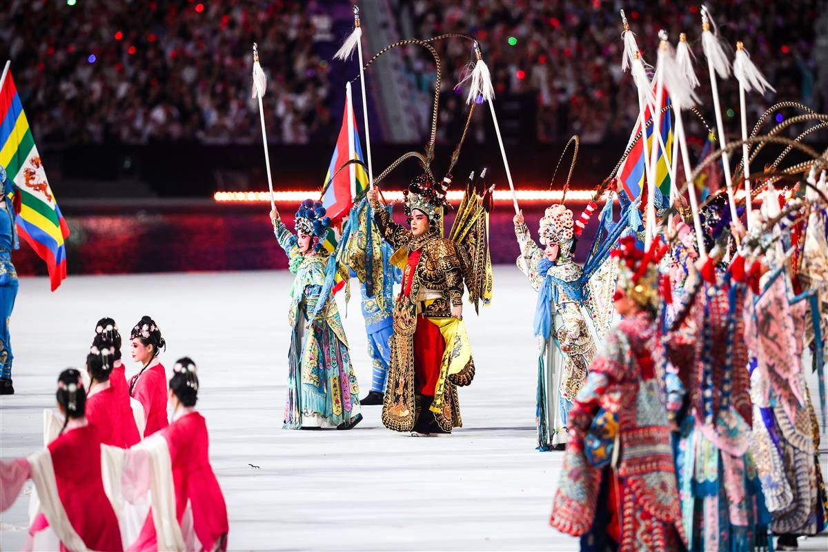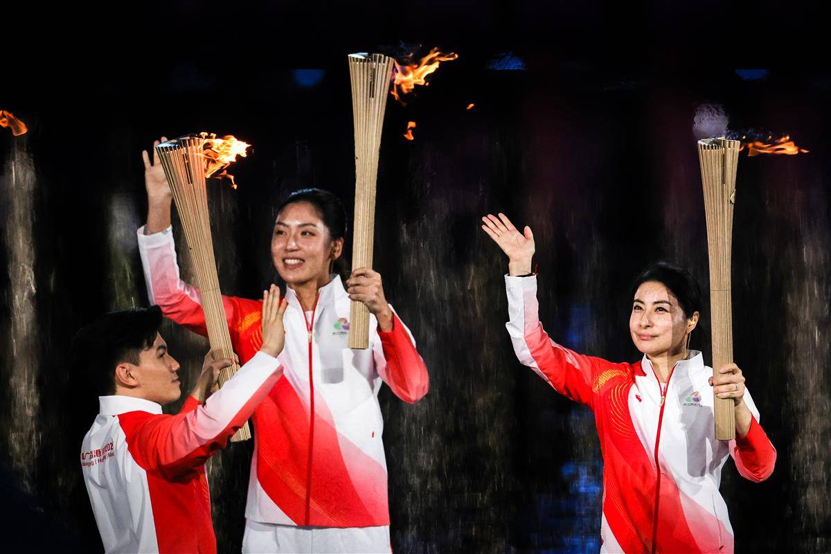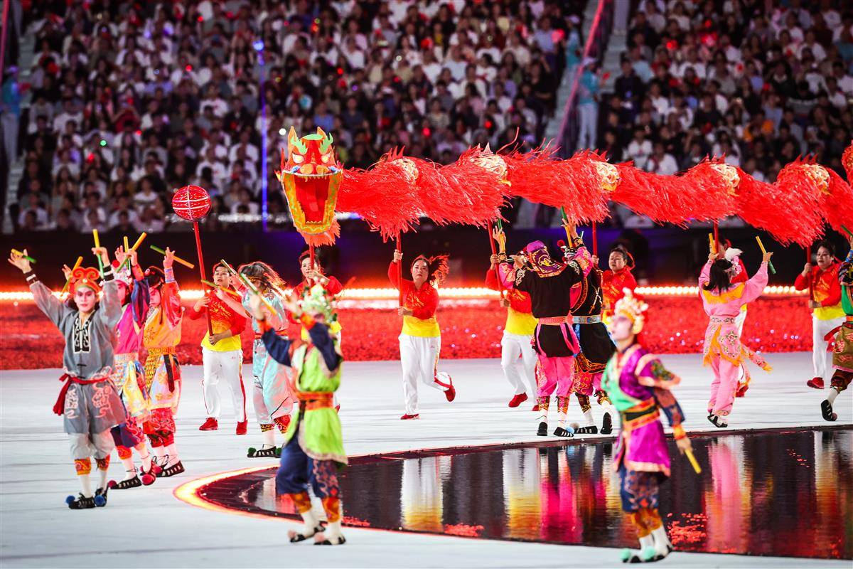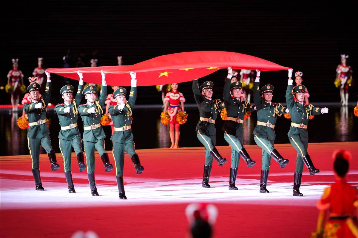 开幕式以“圆梦未来”为主题,开幕式设置“同根同源”“同心同缘”“同梦同圆”三个篇章,运用裸眼3D、人工智能等技术,结合粤语流行歌、非遗技艺等岭南文化符号,实现粤港澳三地同步升国旗仪式。(湖北日报全媒记者 时龚)