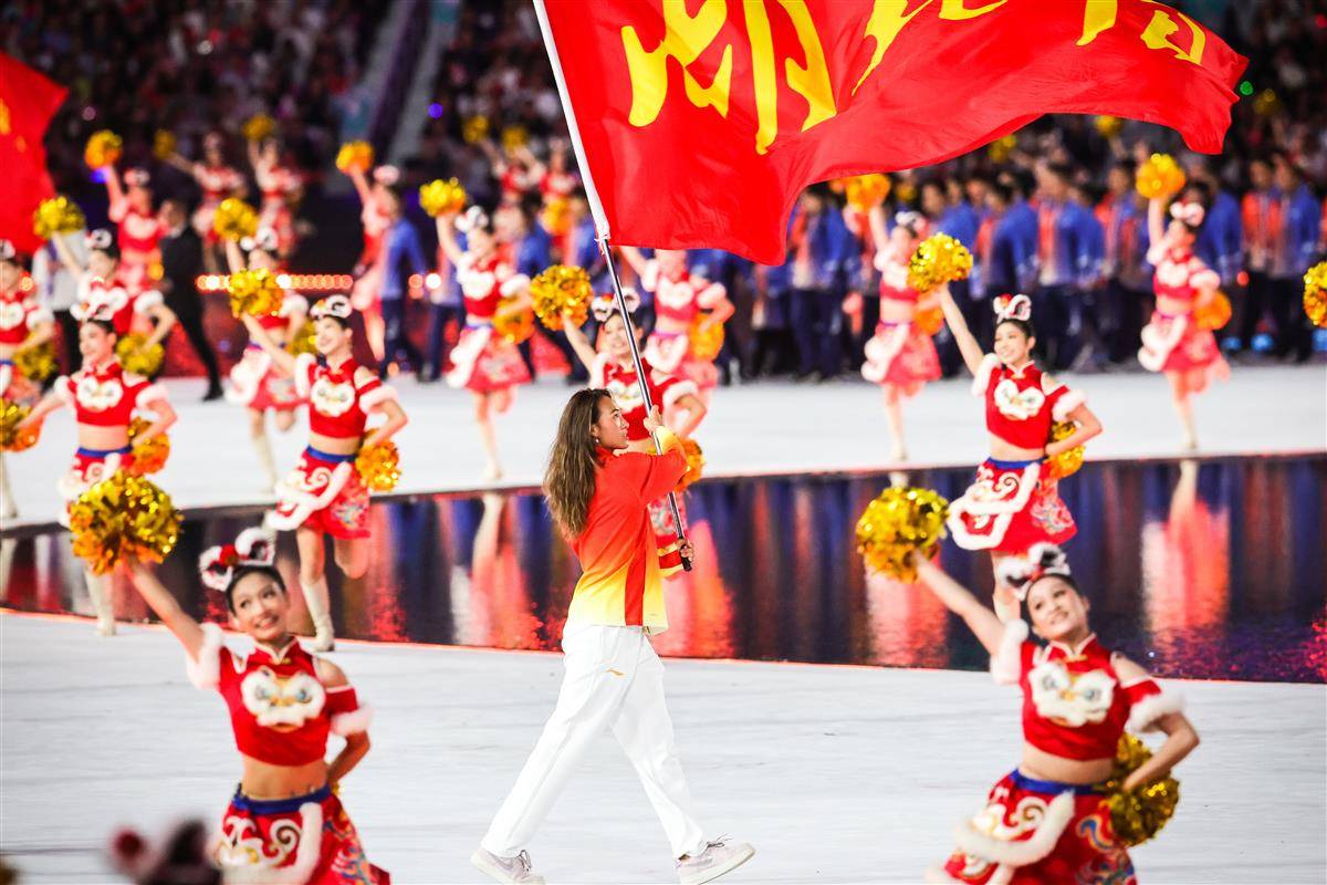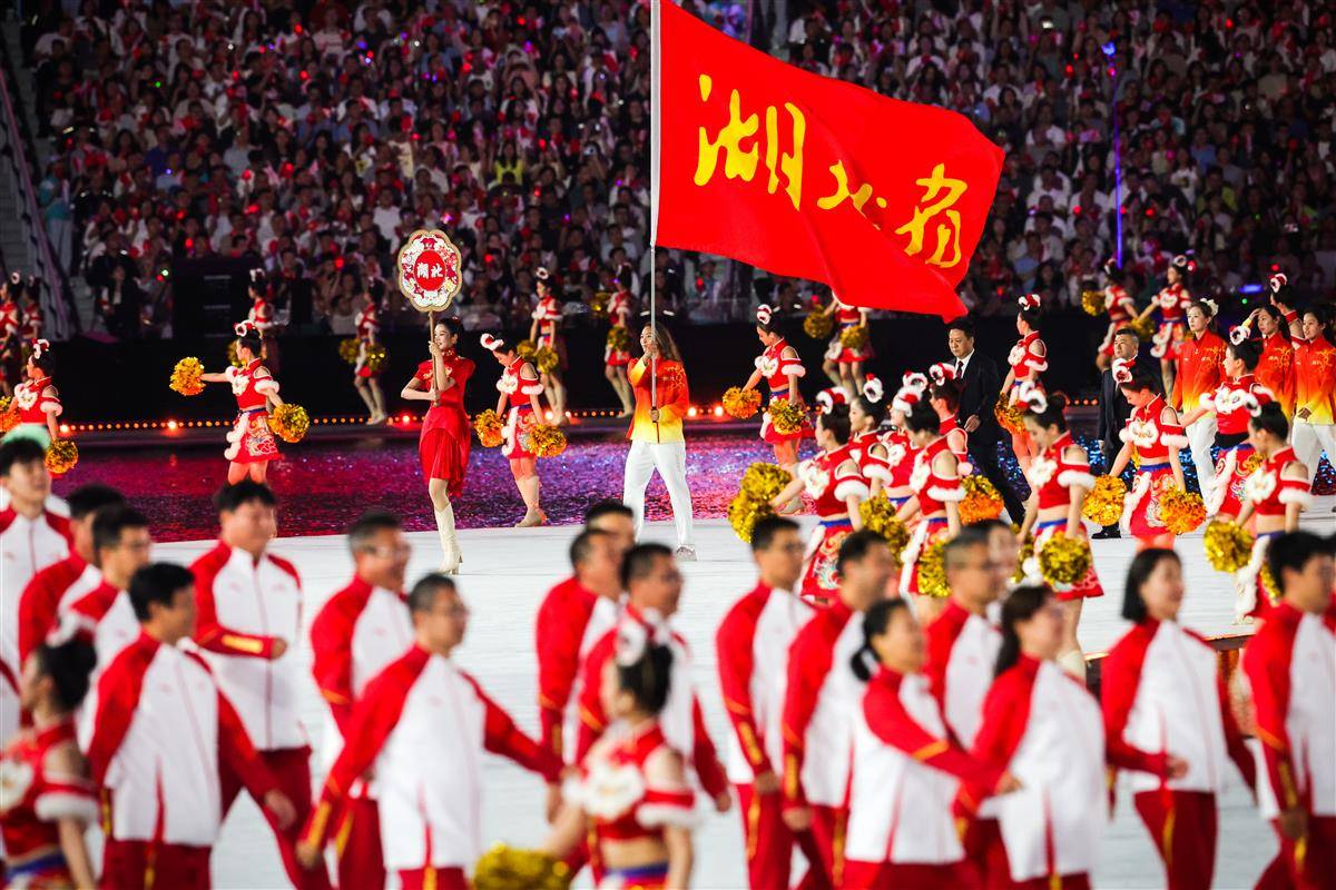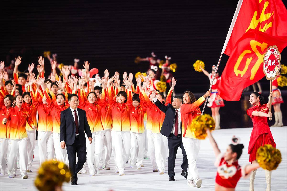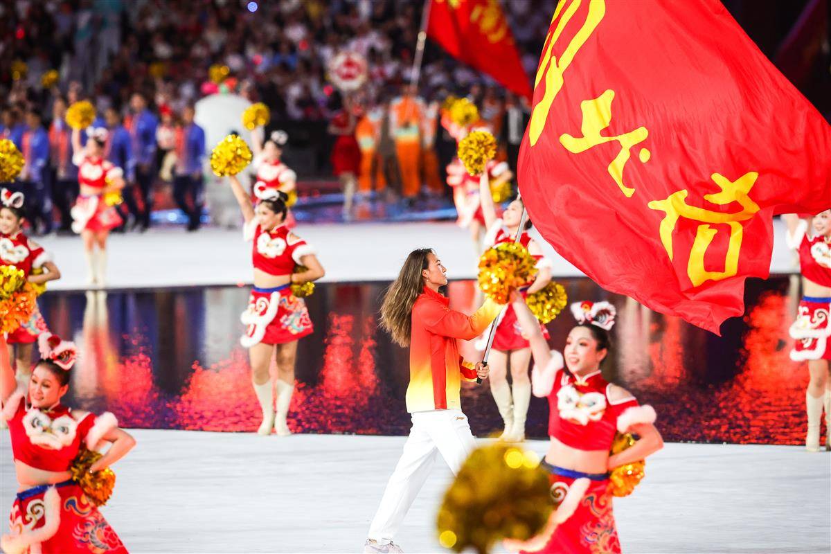 中华人民共和国第十五届运动会开幕式11月9日晚在广东奥林匹克体育中心举行。在代表团入场环节,巴黎奥运网球冠军郑钦文高举湖北省代表团团旗引领湖北省代表团入场。(湖北日报全媒记者时龚摄)