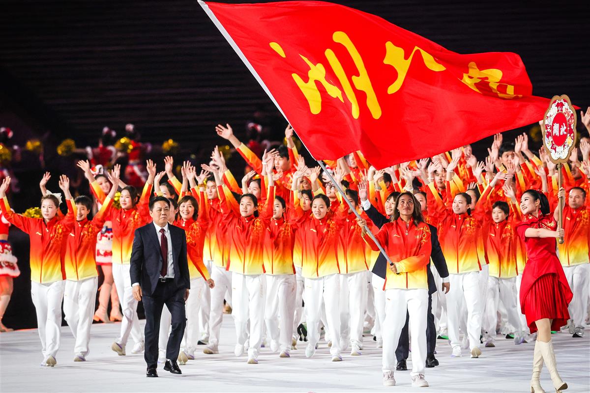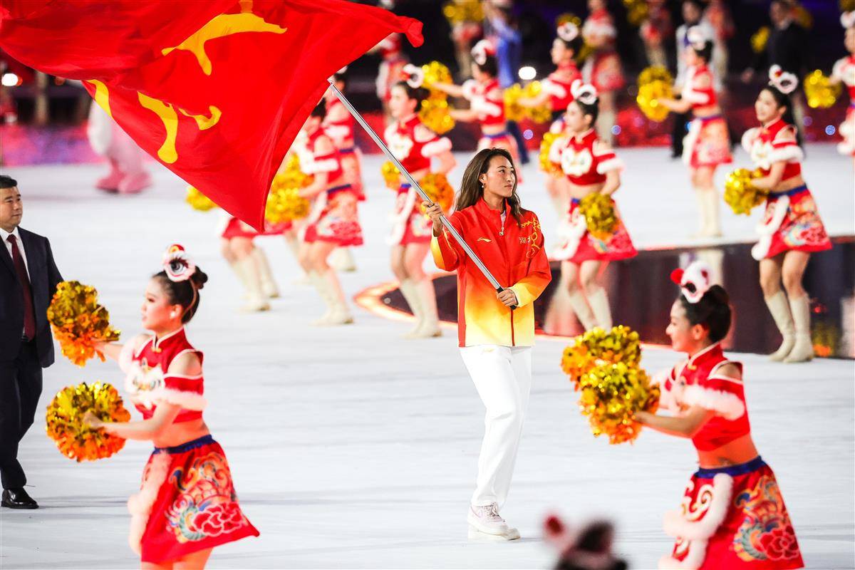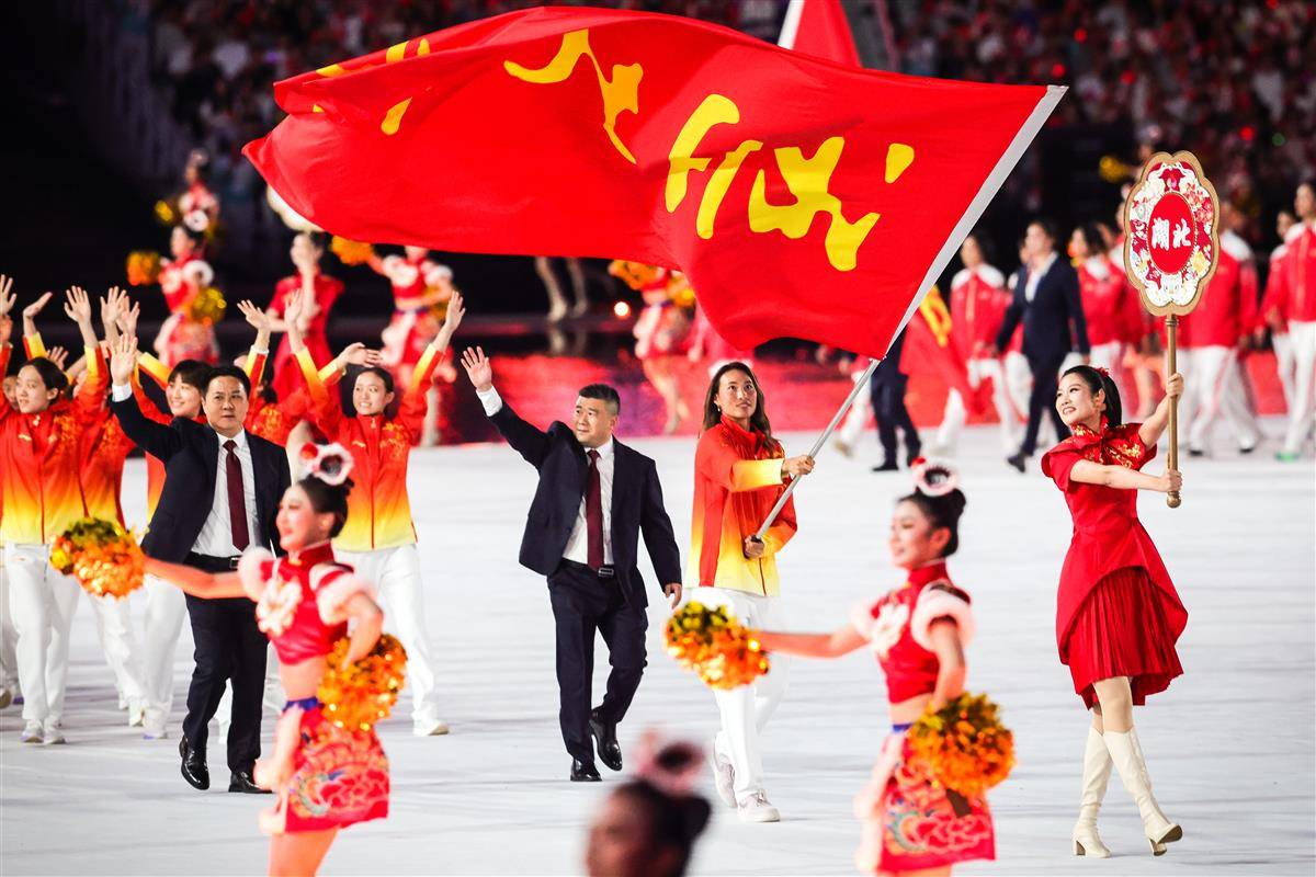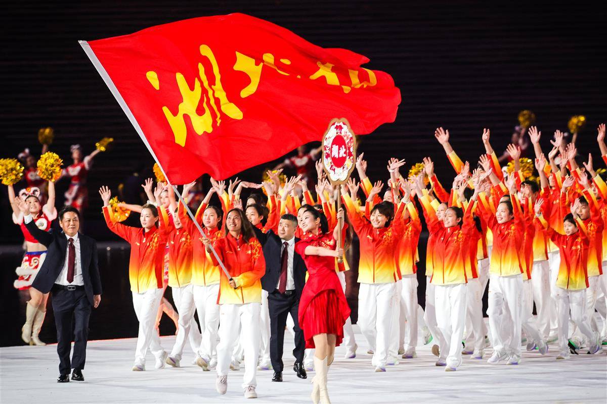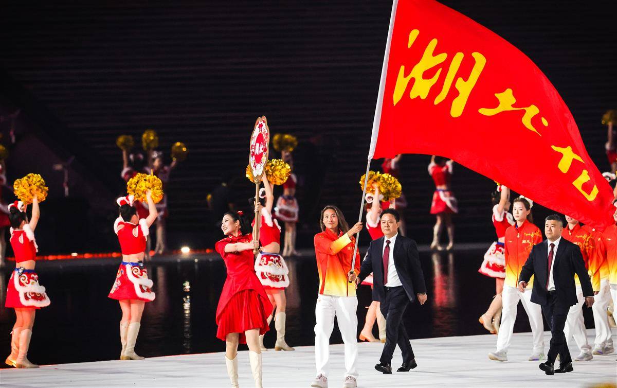 中华人民共和国第十五届运动会开幕式11月9日晚在广东奥林匹克体育中心举行。在代表团入场环节,巴黎奥运网球冠军郑钦文高举湖北省代表团团旗引领湖北省代表团入场。(湖北日报全媒记者时龚摄)