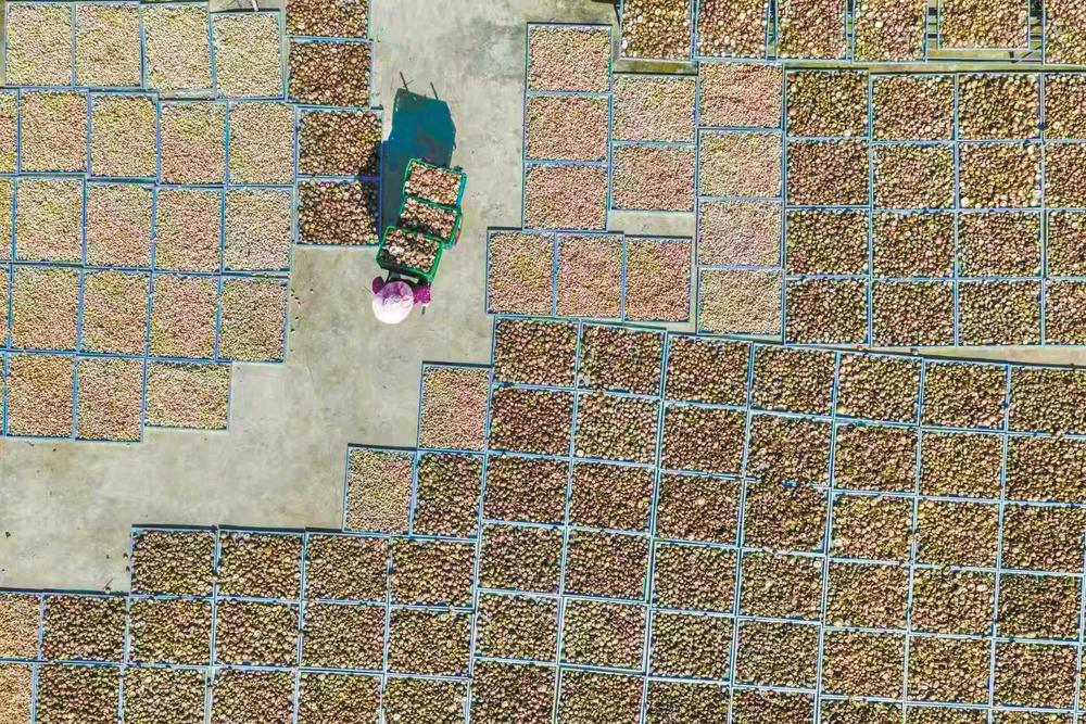 11月5日,在枣阳市刘升镇榆树村,村民忙着晾晒刚采收的香菇。