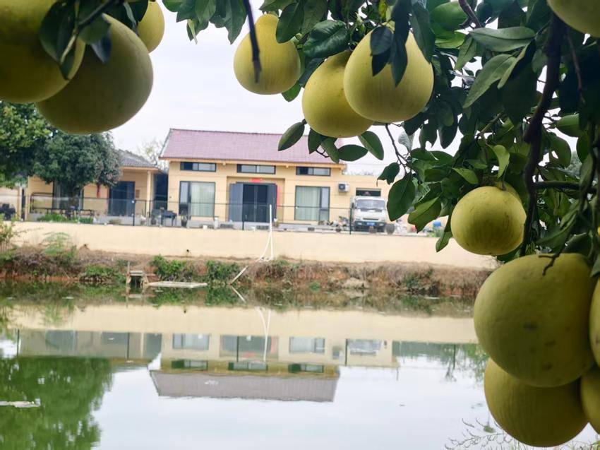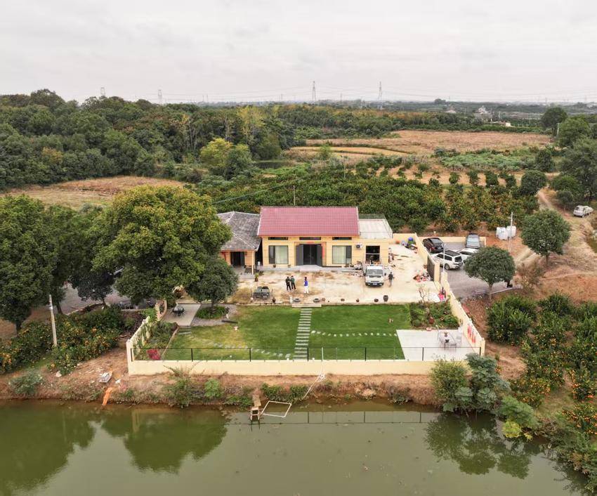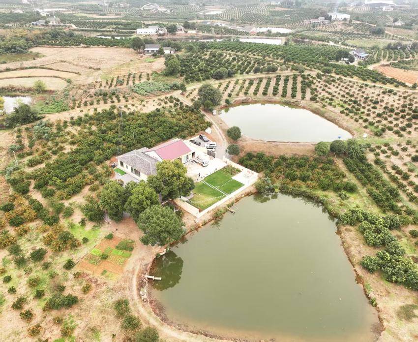 11月8日清晨,记者与友人一同从宜昌市区出发,沿着汉宜高速一路向西疾驰,仅仅40分钟,便顺利抵达了枝江市仙女镇张家湾村。穿过村口平整的柏油路,一座别具一格的两层小楼映入眼帘:米白色的外墙在阳光的照耀下散发着柔和的光泽,搭配上青瓦飞檐,尽显古朴韵味。门前开阔的场坝与两口波光潋滟的鱼池相连,围墙内,柑橘树沿着地势向远方延伸,一眼望不到尽头——这里,便是庞广强精心打造的“田园综合体”雏形。