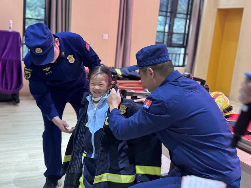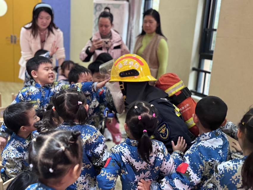 当真实的“火焰蓝”身影出现在幼儿园,孩子们瞬间沸腾了!孩子们围在消防员叔叔身边,睁大眼睛,好奇地触摸厚重的防火服、沉甸甸的头盔,认真聆听消防员叔叔深入浅出地讲解。这一刻,消防安全知识不再是书本上的图画,而是可触可感的真实体验。