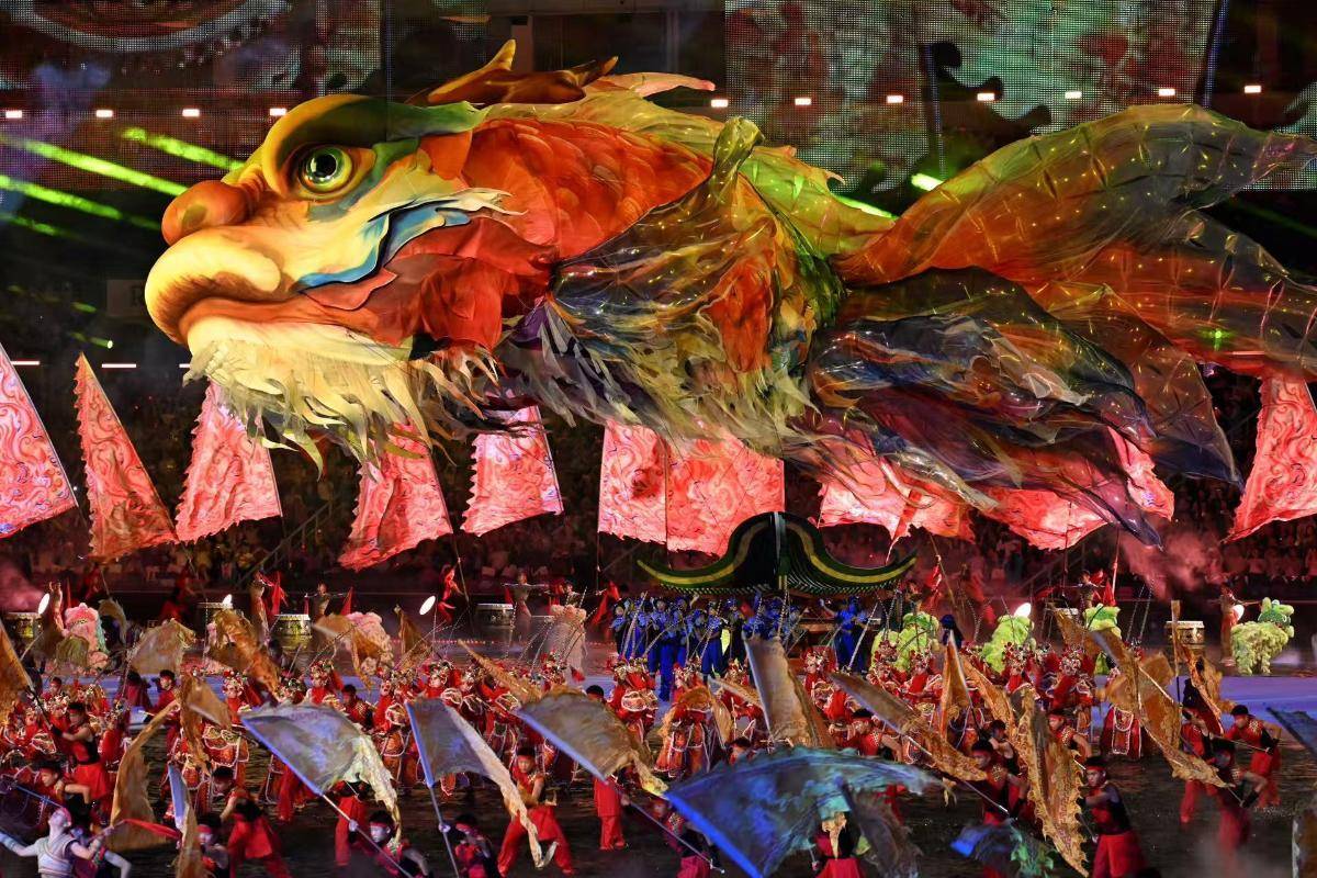 鳌鱼灯、醒狮、英歌舞……11月9日晚,十五运开幕式上,气势磅礴的非遗表演让观众大饱眼福,尤其是长达45米的巨型飞天鳌鱼灯,浮光跃金,遨游四海,将国风美学和岭南特色发挥到淋漓尽致,视觉效果震撼出圈。