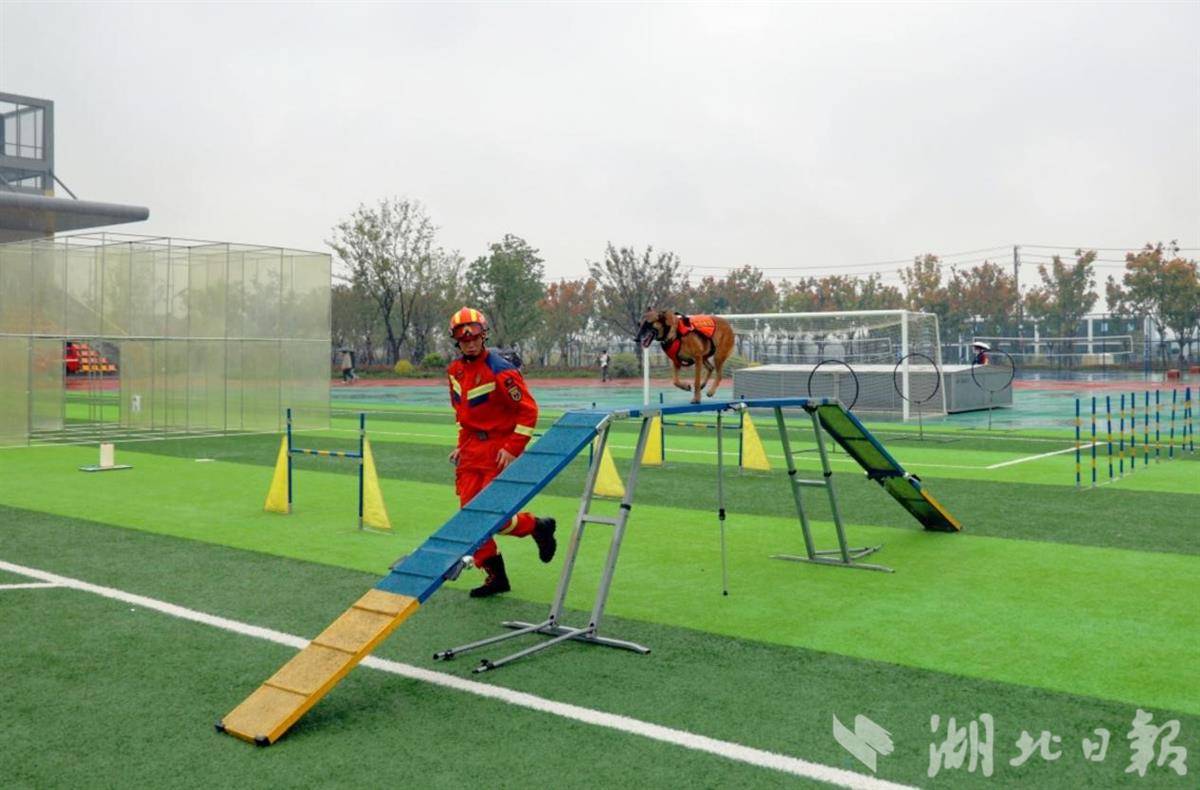 黄冈市“119”消防宣传月启动仪式现场开展搜救犬攀登障碍实战科目演示 张智彬/摄