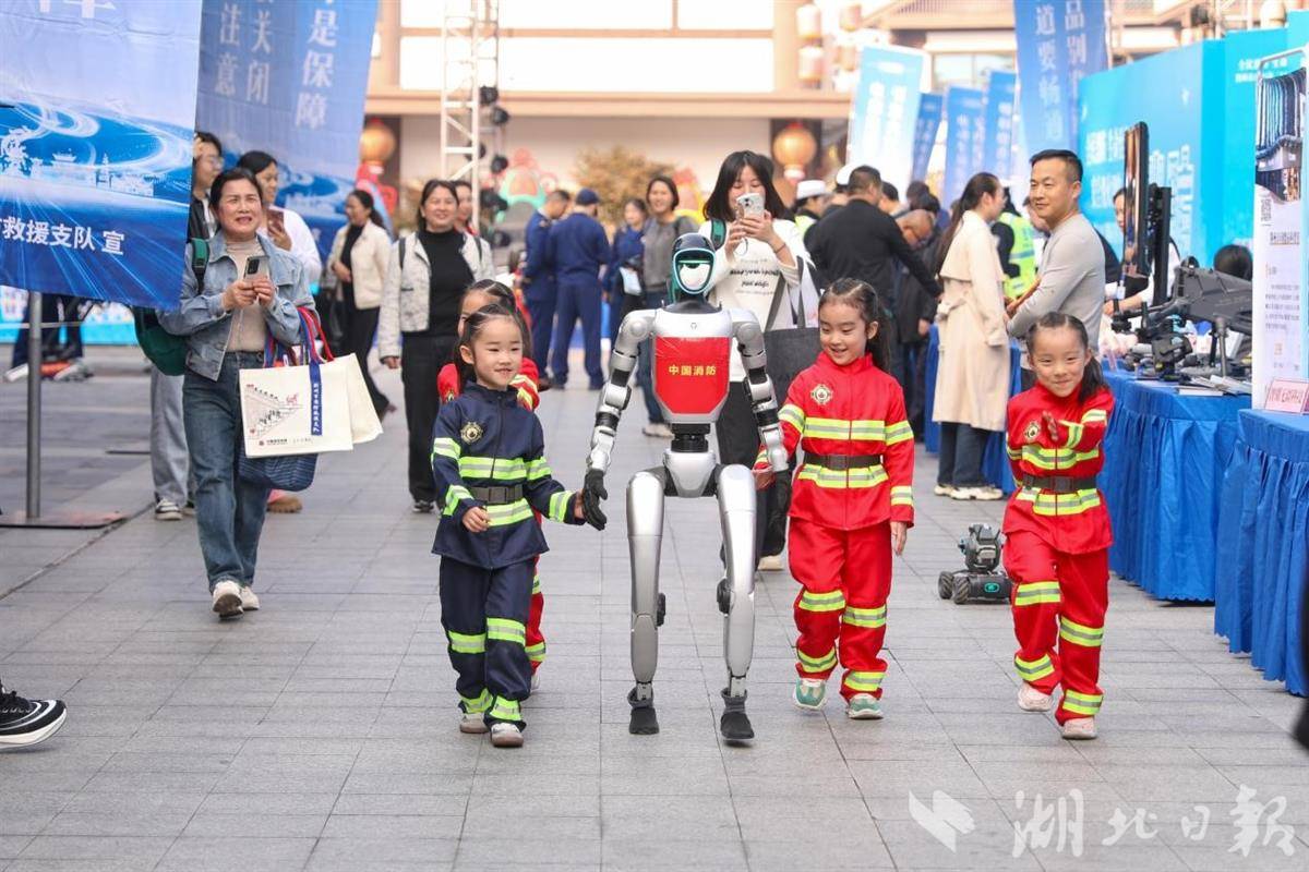 荆州市“119”宣传月启动仪式现场小小消防志愿者与宇树机器人漫游体验区 夏明桐/摄