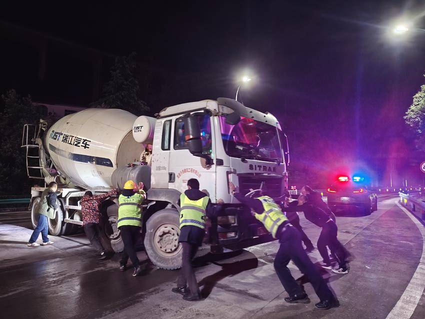 险情就是命令,处置刻不容缓。收费班长发现车辆故障后,第一时间判断现场情况,一边安排人员在故障车辆后方规范设置警示标识,引导后续车辆有序等候,避免交通拥堵加剧;一边火速联系现场施工人员与值守高速巡查人员,明确分工、高效协同。施工人员熟悉大型车辆特性,高巡人员具备现场交通管控经验,收费班长则统筹协调、衔接各方,三方力量默契配合、齐心协力,顶着施工路段的复杂环境合力推车,最终成功将故障大罐车移至安全区域归位。