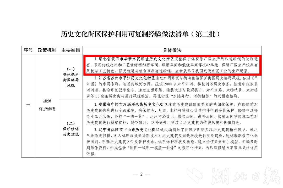 湖北日报讯(记者肖丽琼、通讯员罗汉卿)近日,住房城乡建设部印发《历史文化街区保护利用可复制经验做法清单(第二批)》,被誉为“中国水泥工业的活化石”的黄石市华新水泥旧址历史文化街区入列。加上2024年首批入围的武汉昙华林、荆州沙市洋码头街区,湖北已有3处街区跻身清单,在中部地区构建起“工业遗产、古城风貌、滨水文化”多元协同的保护格局。
