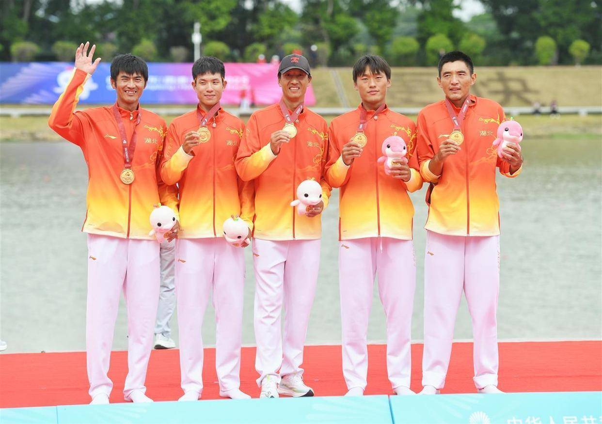 第十五届全运会男子四人单桨1500米决赛,潜江籍运动员孙露(右一)与队友李文雷、张璐通、刘治宇,以4分20秒67的佳绩勇夺冠军。