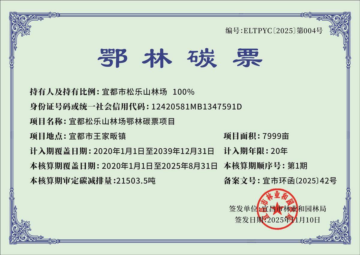 宜都市国有松乐山林场是宜昌市22个国有林场之一,本次签发的林业碳票由松乐山林场作为项目业主,项目区总面积7999亩,项目碳减排量计入期共20年,第一个核算期为2020年1月1日至2025年8月31日,经具备资质的第三方机构调查监测,首个核算期内共产生碳减排量21503.5吨,根据当天市场价格测算,该张碳票价值为129万元。这张碳票如同森林的“碳汇身份证”,将固碳释氧的生态功能从“无价”转为“有价”,使其成为可用于市场交易、质押贷款等用途的绿色资产,有效激活了长期“沉睡”的林业碳汇资源。