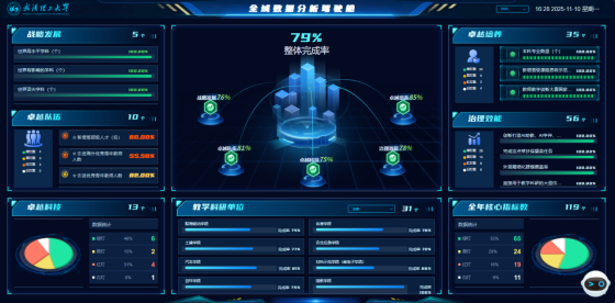 打造支撑智慧决策的评估平台。学校以数字化转型重构质量评估工作体系,重点建设全域数据分析驾驶舱和二级单位数据画像系统,实现校、院、部门三级红绿灯动态预警与报告自动生成,集成高质量发展指标监测与多维度数据分析功能,形成“一屏统揽全局、一键穿透溯源”的态势感知分析能力,打通部门数据壁垒,实现全量信息互联互通,为精准干预与闭环管理提供数据支撑。