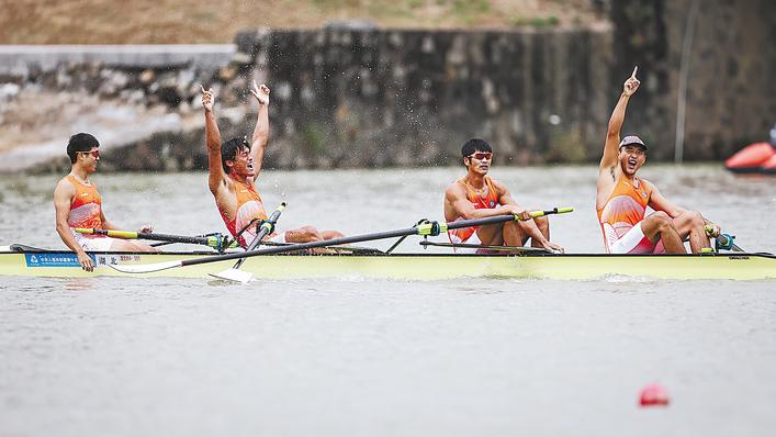 男子项目颁奖的同时,女子四人单桨决赛鸣枪。“冲啊!”男队员们齐声助威。四位巾帼一马当先,她们桨频稳定,力量十足,逐渐将对手甩开,最终以绝对优势稳稳夺金。