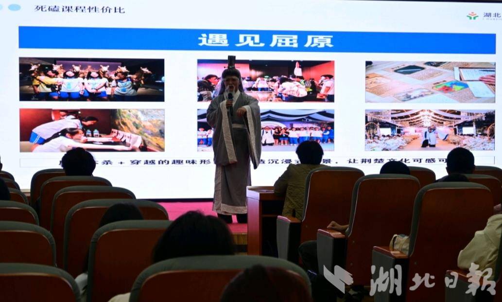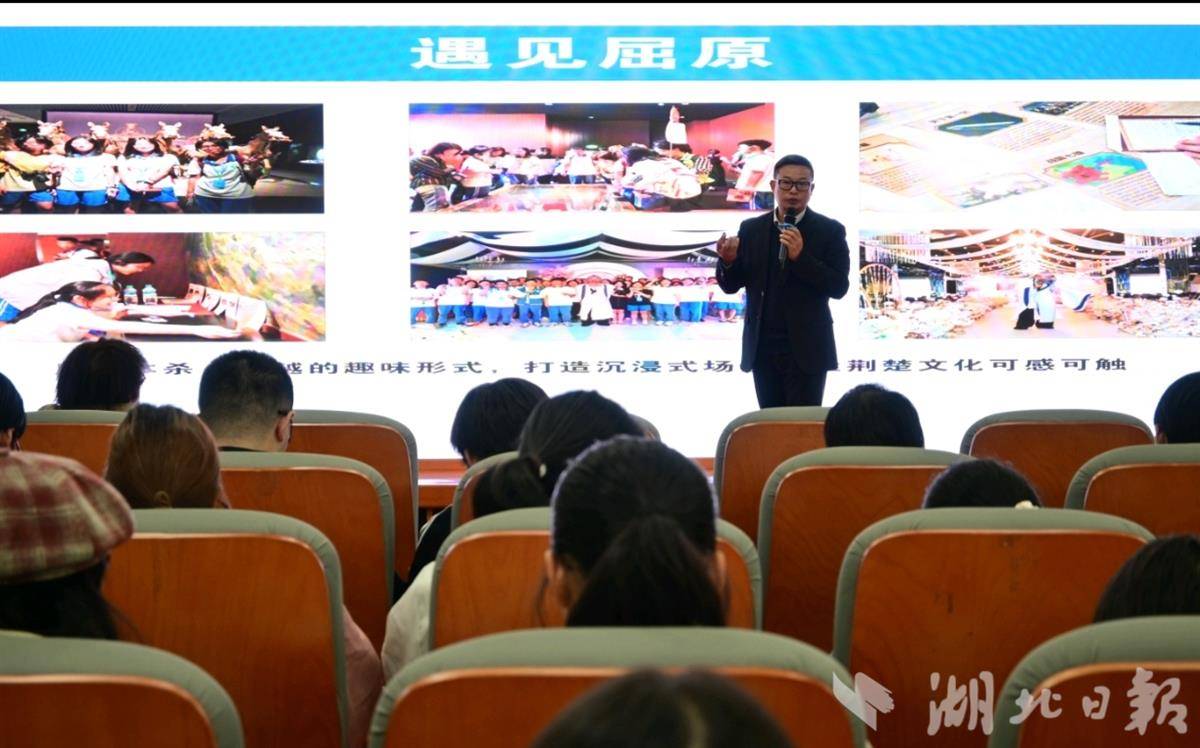 在现场沉浸式表演——“屈原”吟诵《离骚》《九章》等楚辞名篇之后,习德峰以武汉的“荆风汉韵,筑梦江城”旅游项目为案例,进一步讲述历史资源创造性开发的路径:在湖北省博物馆,针对“越王勾践剑”和“曾侯乙编钟”设计的“解密挑战”任务,让参与者在破解密码的过程中主动探索历史;“遇见屈原”的穿越式互动,让千年前的历史人物变得有血有肉。在东湖听涛景区,项目将屈原文化与流行的“角色扮演推理”游戏结合,“真假屈原”的趣味活动让参与者在提问与甄别中更加亲近楚文化。而在黄鹤楼与辛亥革命纪念馆,“诗词朗诵”“街头采访”等互动任务,让历史遗产转化为可参与、可表达、可传播的个性化体验……