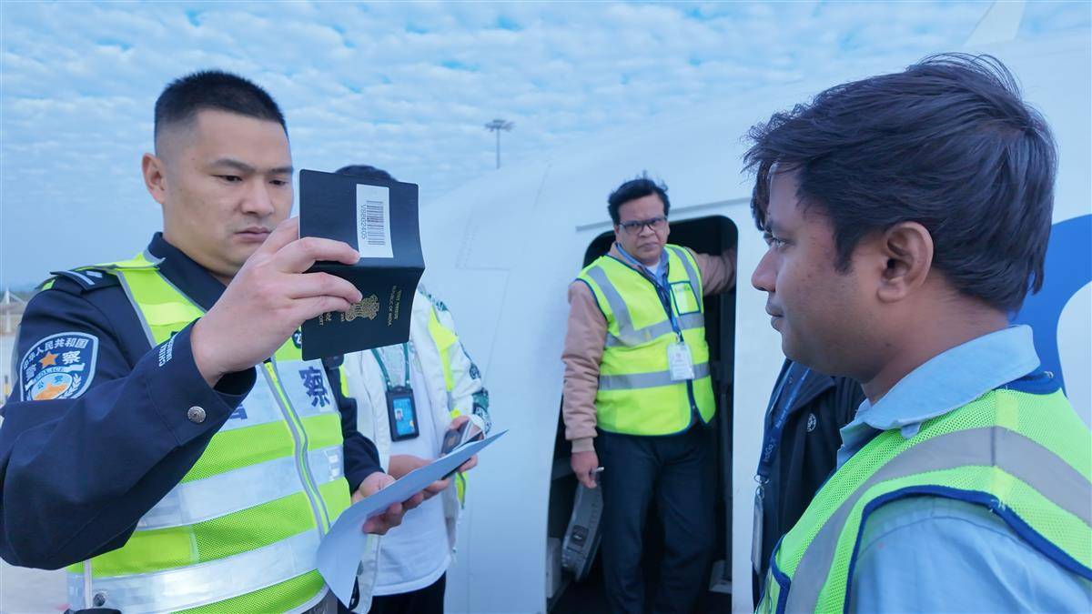 图为移民管理警察为机组办理出入境手续。(通讯员李磊摄)