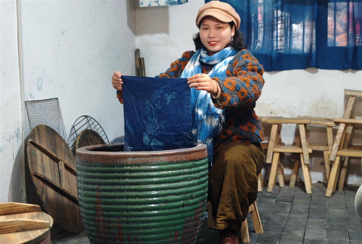 如今,工坊的六口老缸已成为“镇店之宝”。每天下班前,曾亚兰会端着酒杯,给每口缸喂上一两白酒。“这可是古法秘方——染缸中加入纯粮酒和糖能激活染液、维持菌群活性,让染料从蓝色变成绿色,才能染出青出于蓝的效果!”