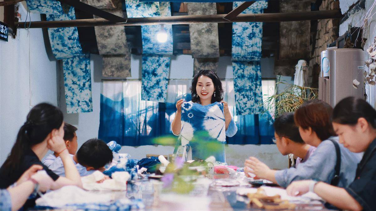 自此,工坊预约电话成了“热线”。孩子们在此扎布、浸染、晾晒,看着布料从绿色逐渐氧化为蓝色,惊叹声不绝于耳。“有个小朋友连续来了十几次,催我开发新产品,说过生日也要包场做手工!”