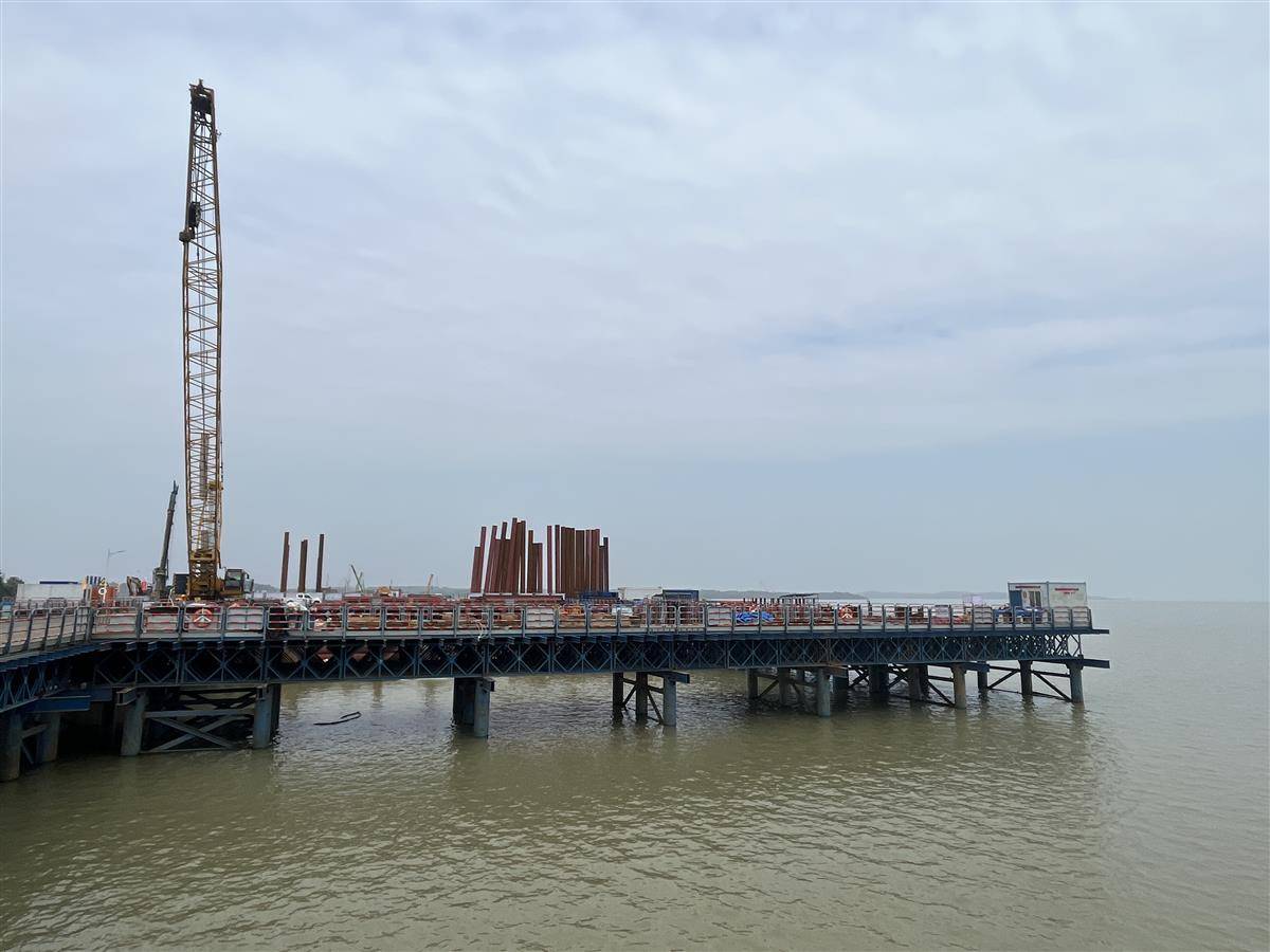 深达10米的基坑围堰、繁杂的V型墩施工以及高空、水上、有限空间等多重高风险作业环境交织,让大桥的每一步建设都充满了考验。面对重重难点,建设者们以一系列技术创新作为回应,不仅攻克了难题,更实现了节能降耗、绿色环保的目标。