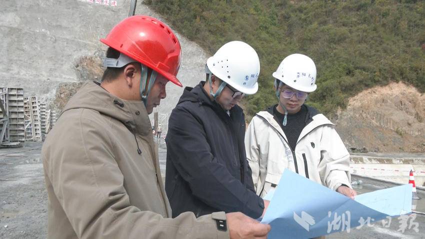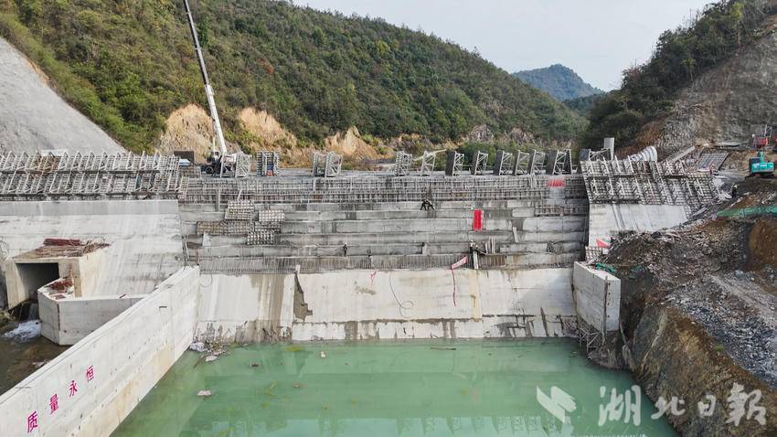 11月12日,在崇阳县天城镇河田村的项目施工现场,水库主坝已初具规模,坝体高度持续攀升。主坝两侧,工人们各司其职、有序作业,正紧锣密鼓地进行大坝模板、钢筋绑扎等工作,为下一层坝体浇灌筑牢基础。