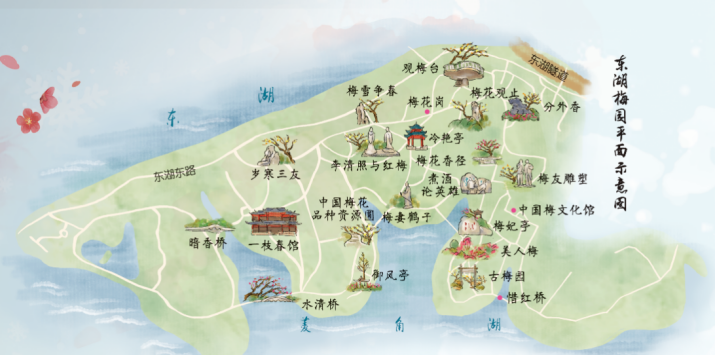 此次的梅花地图以“梅花-冬雪”为主题,选用淡雪青色为主调,既似初雪覆枝的薄霜清冷,又若月下梅影的朦胧雅致。设计上融合传统水墨韵味与现代数字制图技艺,通过留白与渲染的手法,展现“遥知不是雪,为有暗香来”的诗意境界,整体营造出清雅高洁、含蓄深远的东方美学意境。