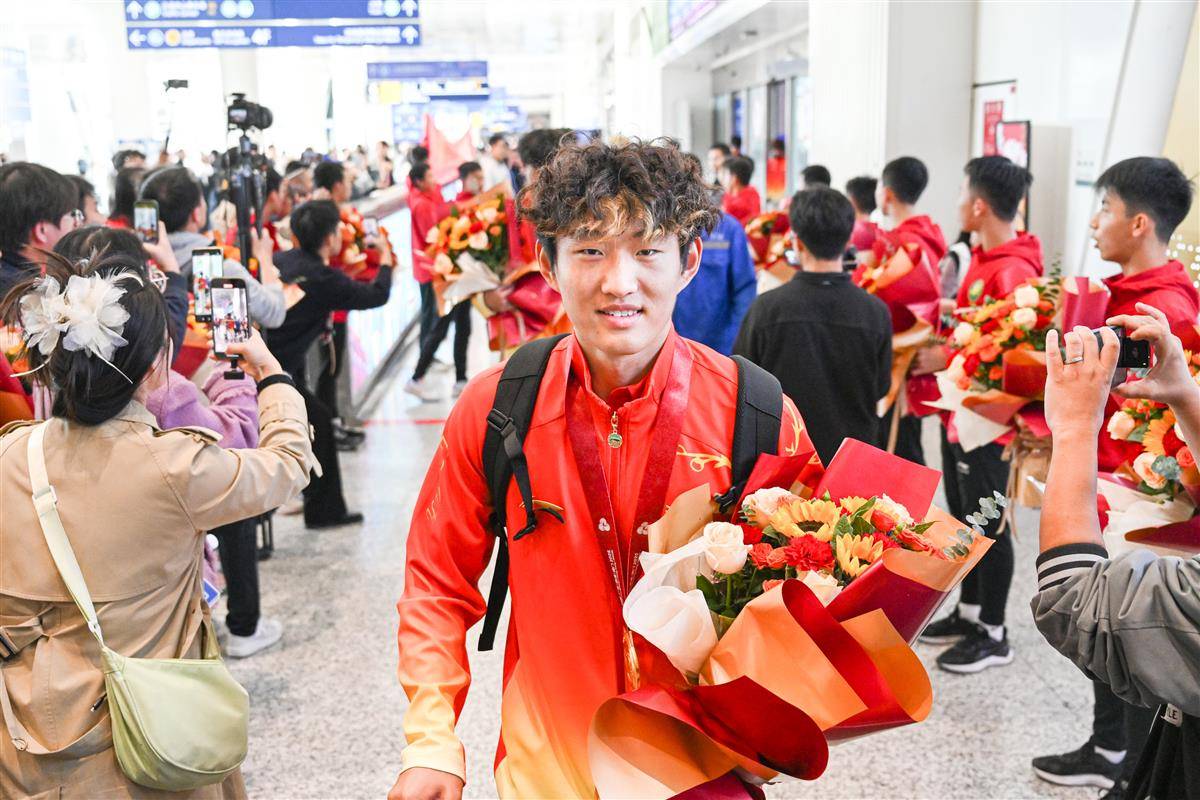湖北队队员孙康博率先走出机场出口。在11月12日全运会U20男足决赛中,孙康博凭借最后时刻的世界波将比分扳平,成功扭转“战局”。(湖北日报全媒记者 任勇 摄)