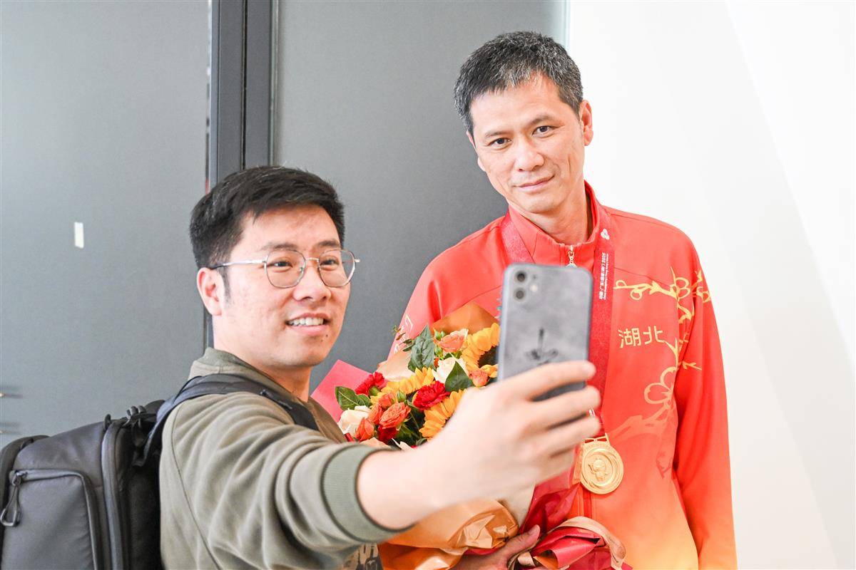 现场接机的球迷与湖北队主教练高峰合影。(湖北日报全媒记者 任勇 摄)