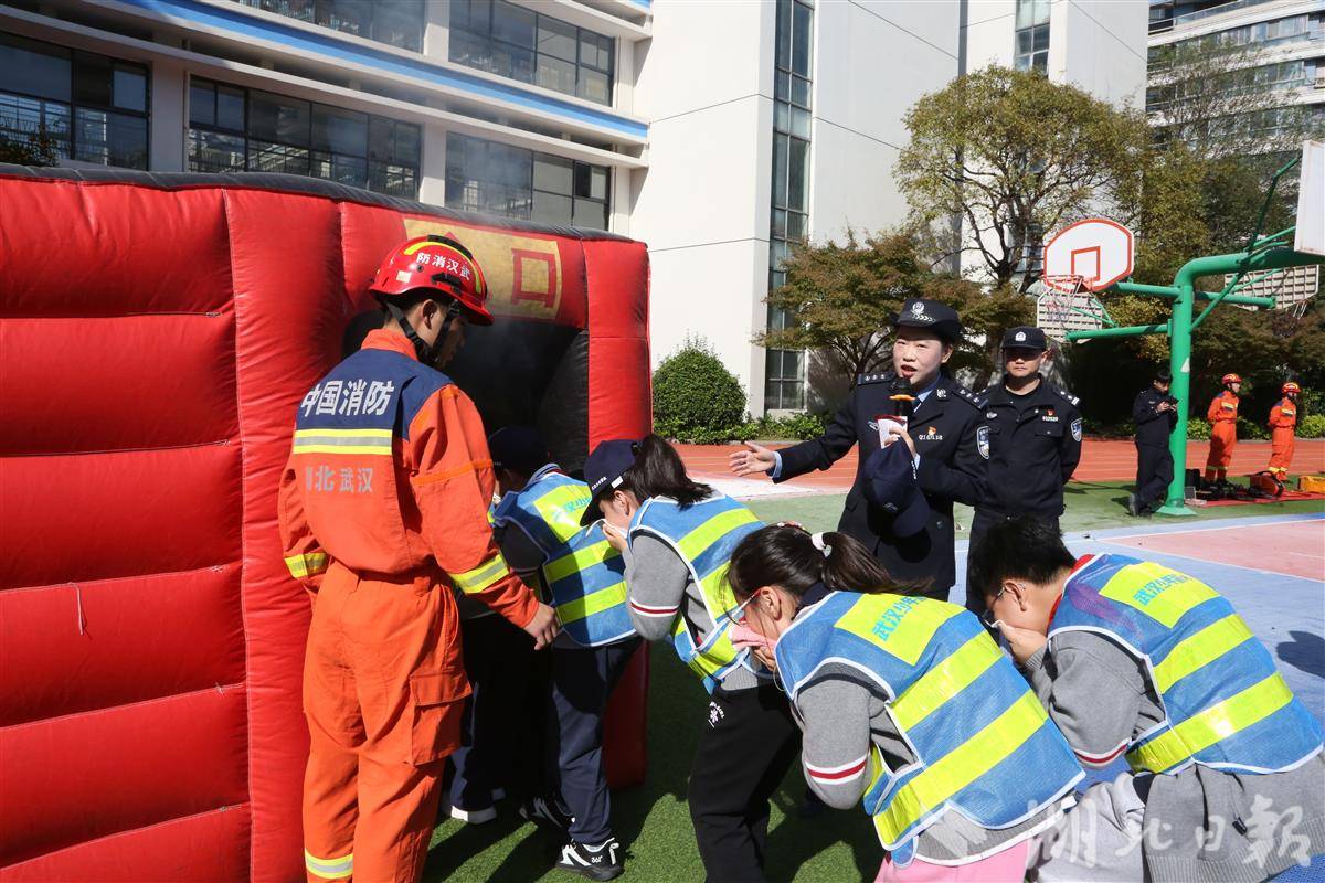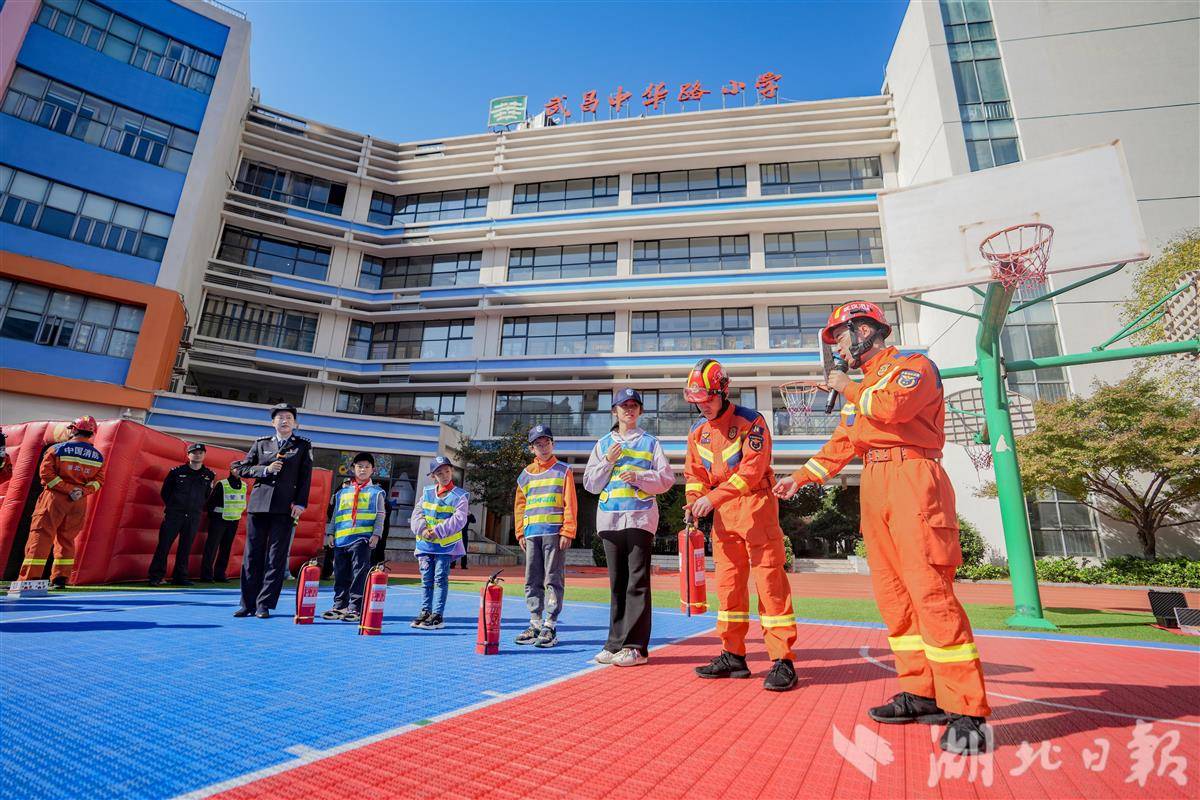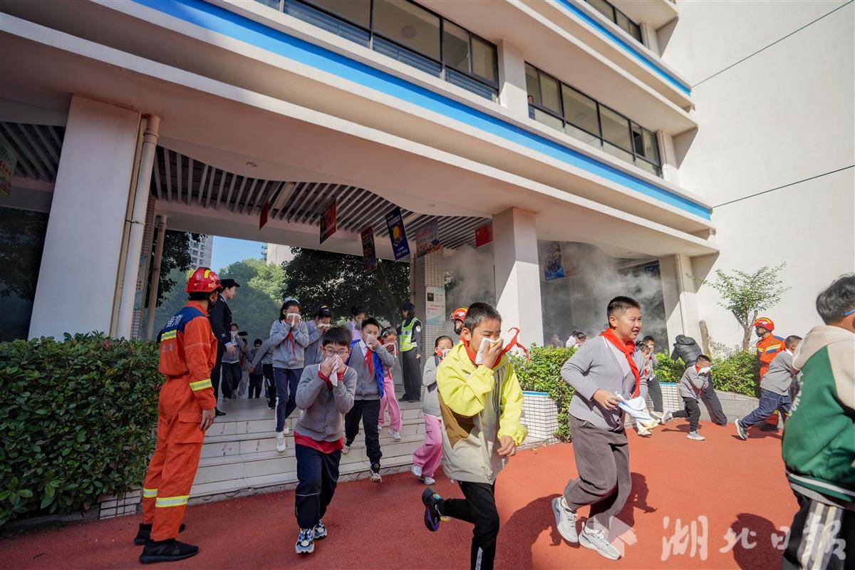 湖北日报讯(记者杨然、通讯员胡子昂)“弯腰捂鼻、不慌不挤!”在警报声中,孩子们有序列队,快速疏散到操场上。11月13日上午,武汉少年警队联合积玉桥消防救援站,为武昌区中华路小学金都校区师生带来了一场特别的“消防安全实战课”,他们在浓烟模拟的“火场”中学习逃生,在消防员的指导下亲手操作灭火器。