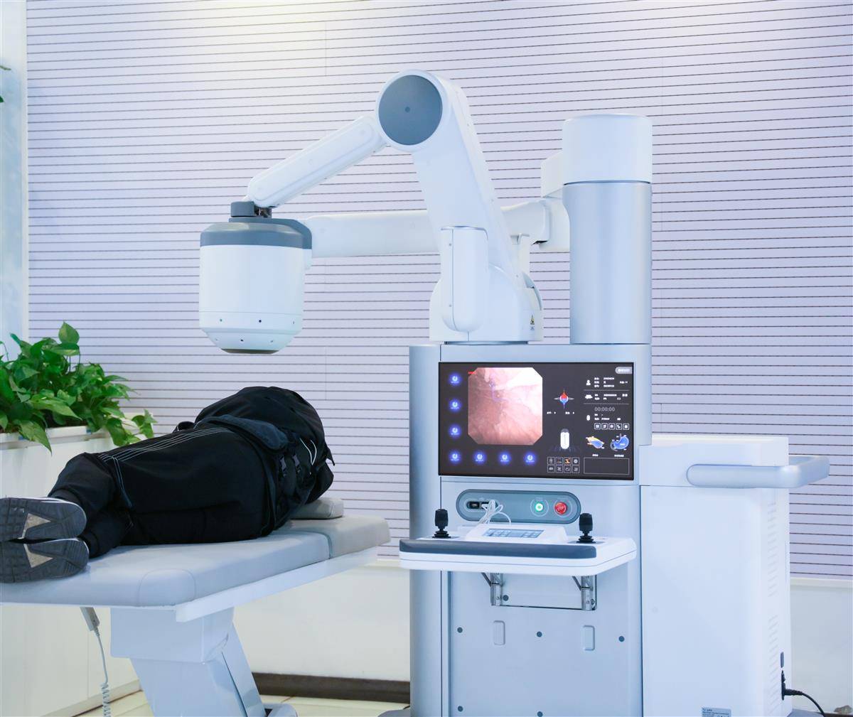 受检者吞下胶囊内窥镜后,躺在检查床上,医生一键开启自动检查模式,设备便按照系统程序,上下、左右、前后移动,进而控制胶囊内窥镜在患者胃内运动,拍摄胃部情况,并将图片发送到控制系统中。