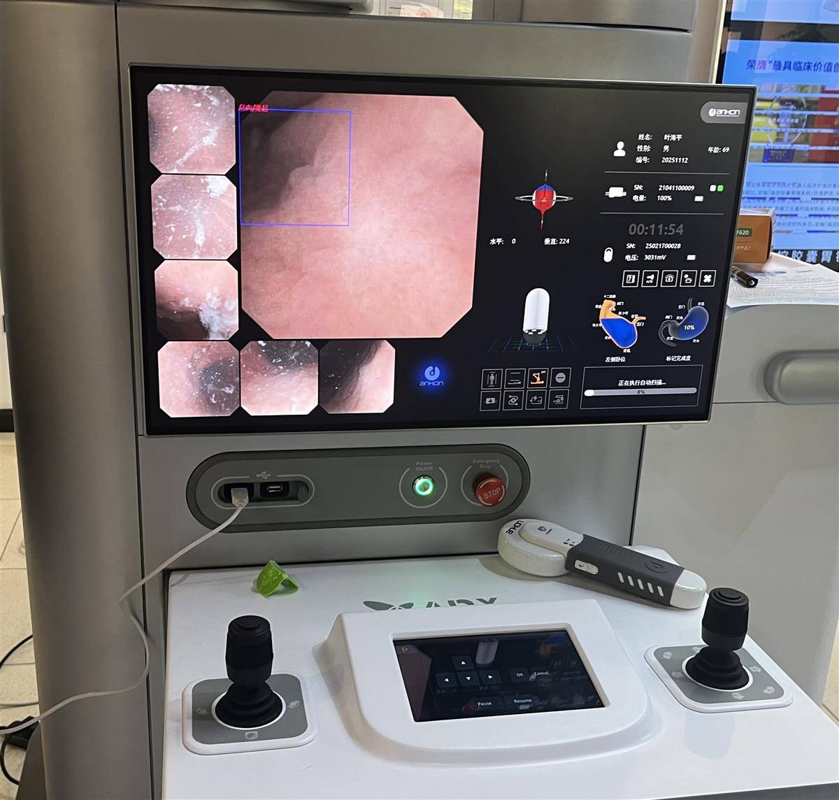 “该系统实现全流程自动化,一名医生可同时操作三台设备,4小时可完成60例胃部检查,大大提高医生的工作效率和检查完整性。并且受检者无需麻醉,随水吞服即可,身体没有任何感觉,免去了传统电子内镜插管的痛苦。”涂超介绍。