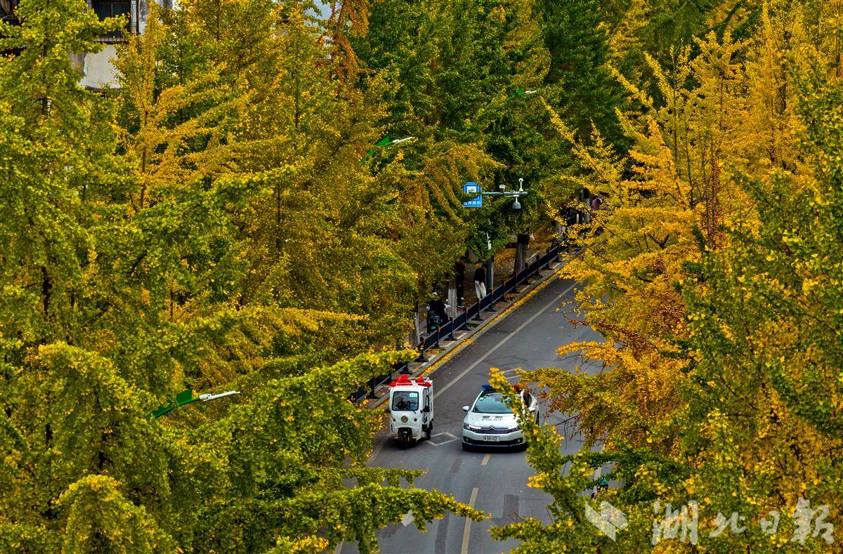 11月11日,荆州古城人民路上的银杏树迎来最佳观赏期,满树金黄与古老城墙相映成趣,为深秋的古城添上一抹亮色,吸引众多市民前来打卡留念。