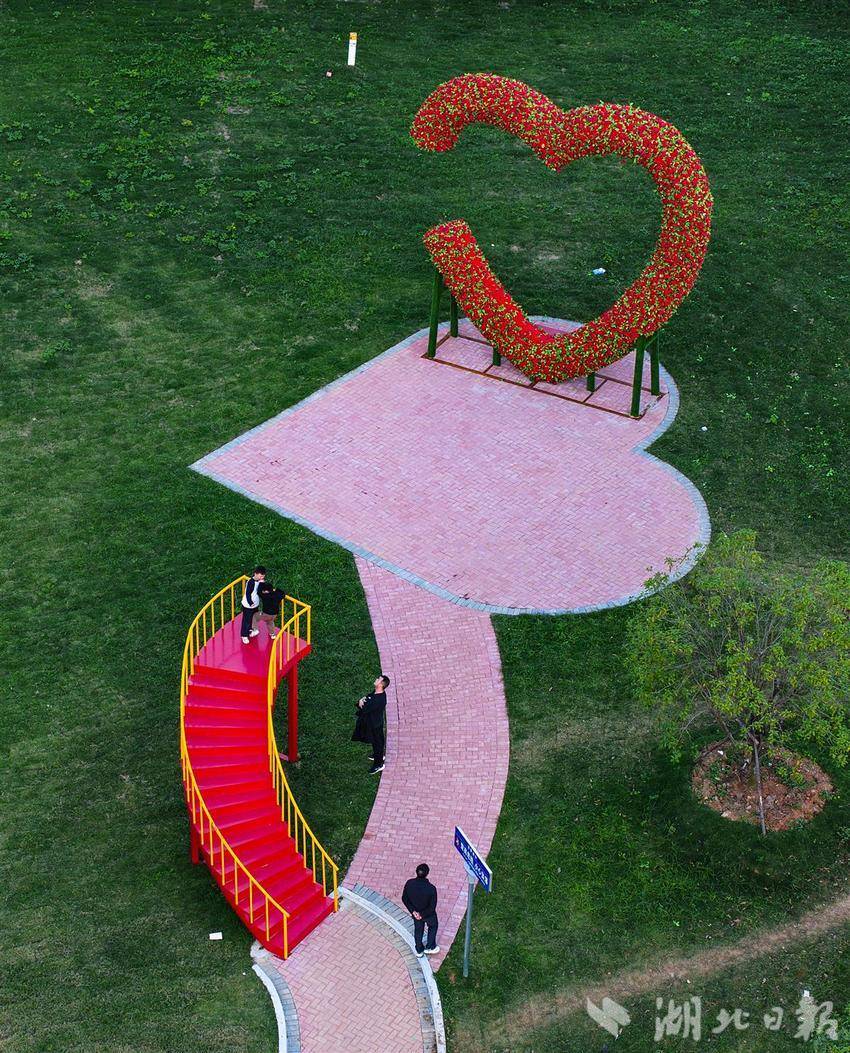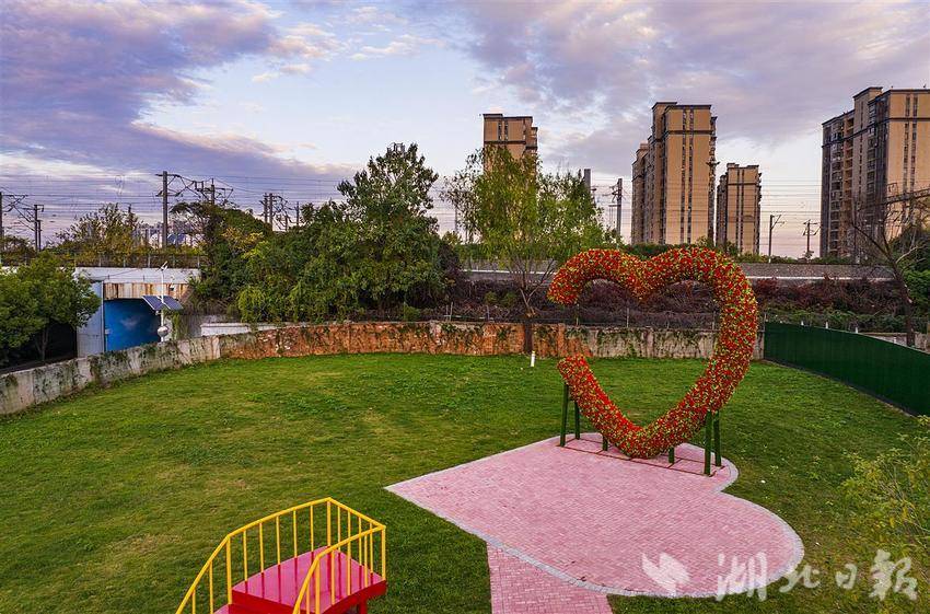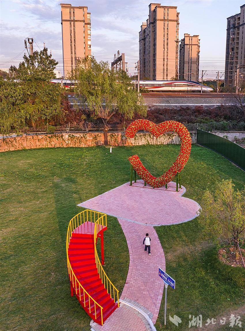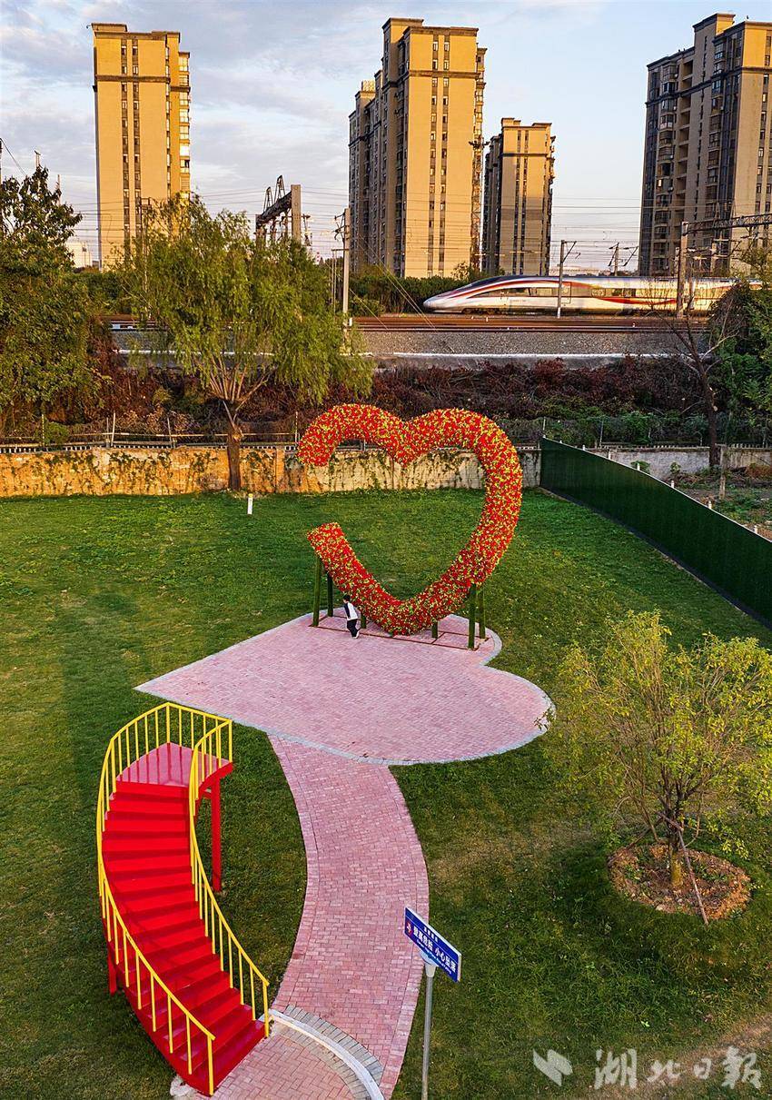 11月13日下午,两名刚放学的孩子在家长的陪同下,登上武汉车站爱尚洪山体育游园的观景楼梯,既能目送高铁列车缓缓驶过,又能轻松定格与“复兴号”合影。观景楼梯旁是一座巨型“红色爱心”造型花篮,站在楼梯上面,以驶过的高铁为背景,既能突出红色爱心的鲜艳,又能捕捉列车穿梭的动态感。游客如果想把落地武汉的“第一眼”美好定格,不妨参考这份打卡攻略,轻松拍出刷爆朋友圈的照片。目前,体育游园已建成开放。(湖北日报全媒记者朱熙勇摄)