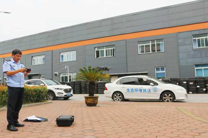 执法人员使用无人机巡查企业有无违规排污口。