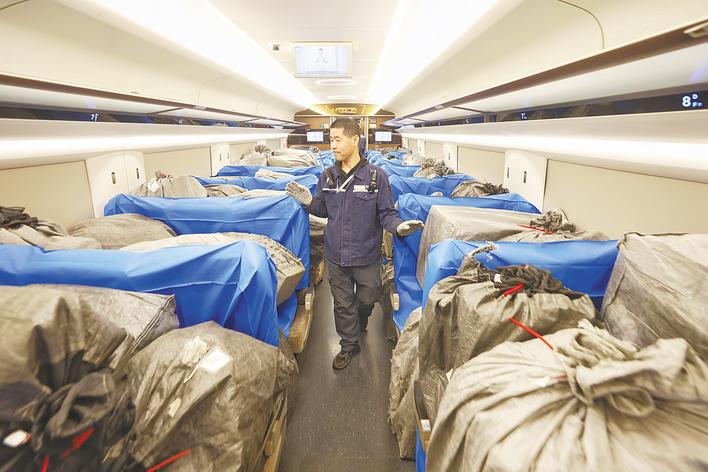 在首趟开出的“复兴号”货运专列上,车厢里,座椅均被保护隔膜保护,座椅上堆放着大大小小的灰色包裹。货物来自顺丰、京东等物流公司,每个包裹上车前均经过了安检。