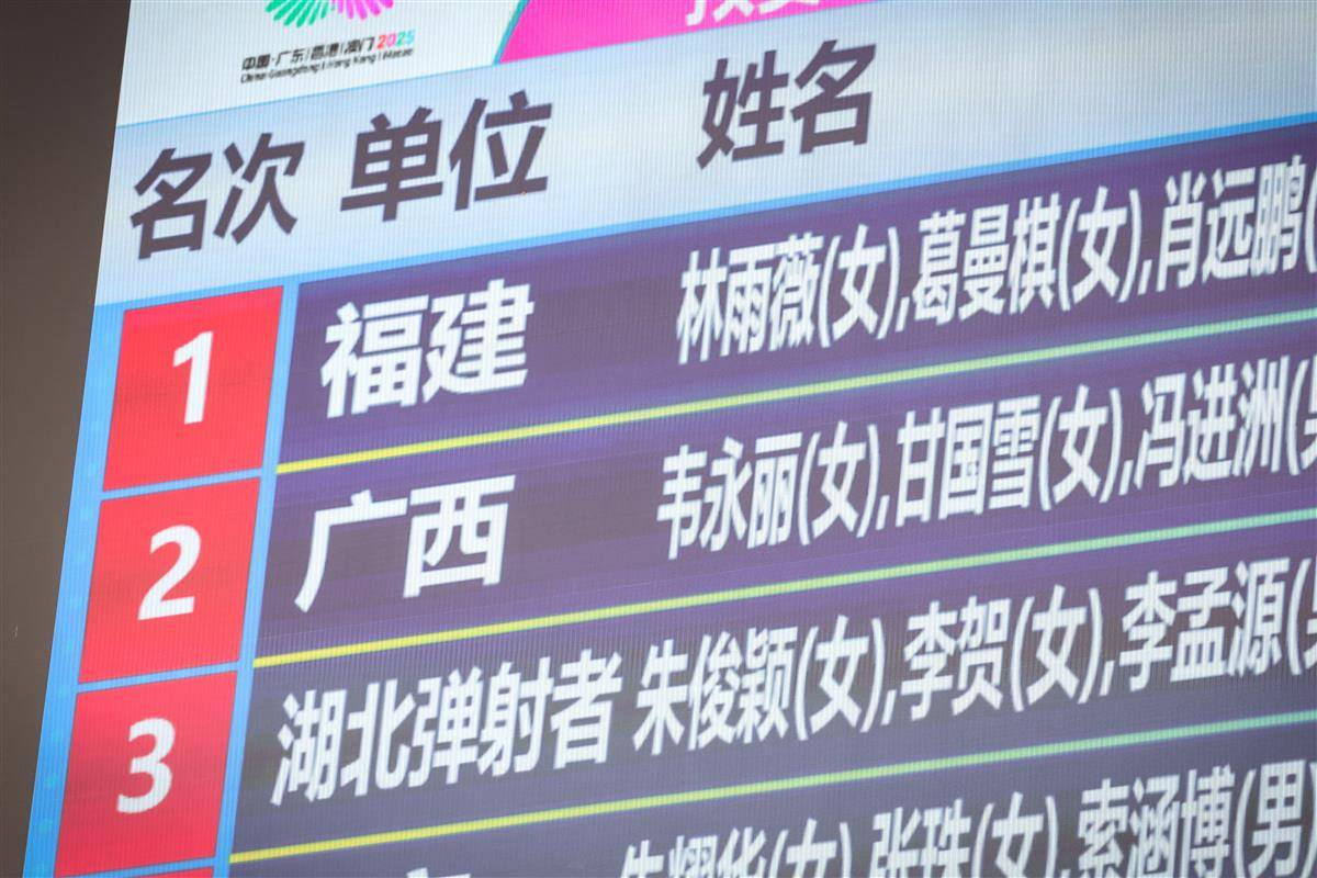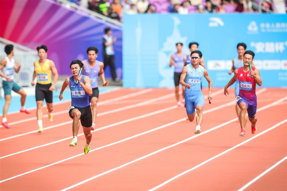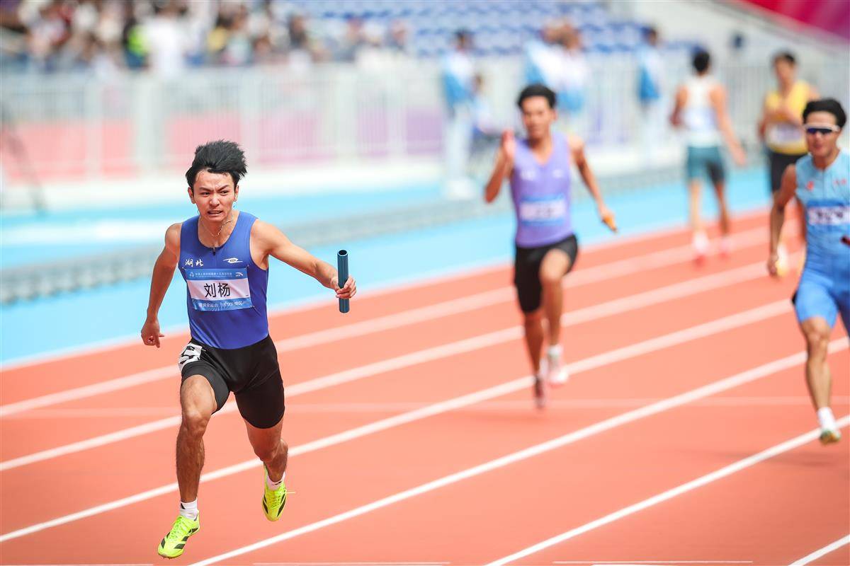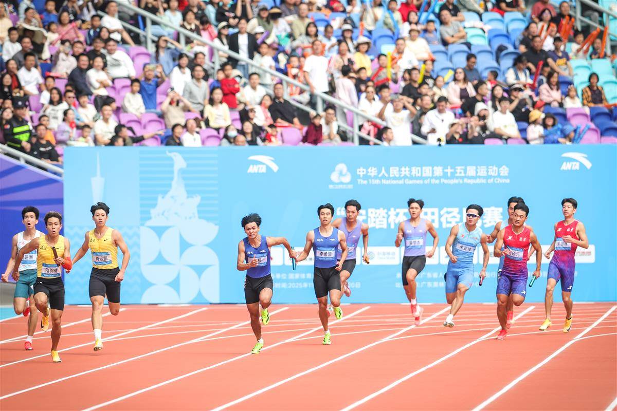 11月15日,广东奥体中心体育场,十五运田径项目开赛日,在4x100米混合接力预赛中,湖北队跑出41秒02的组合最佳,以预赛小组第三、总成绩排名第六的成绩晋级晚间决赛。(湖北日报全媒记者 时龚 摄)