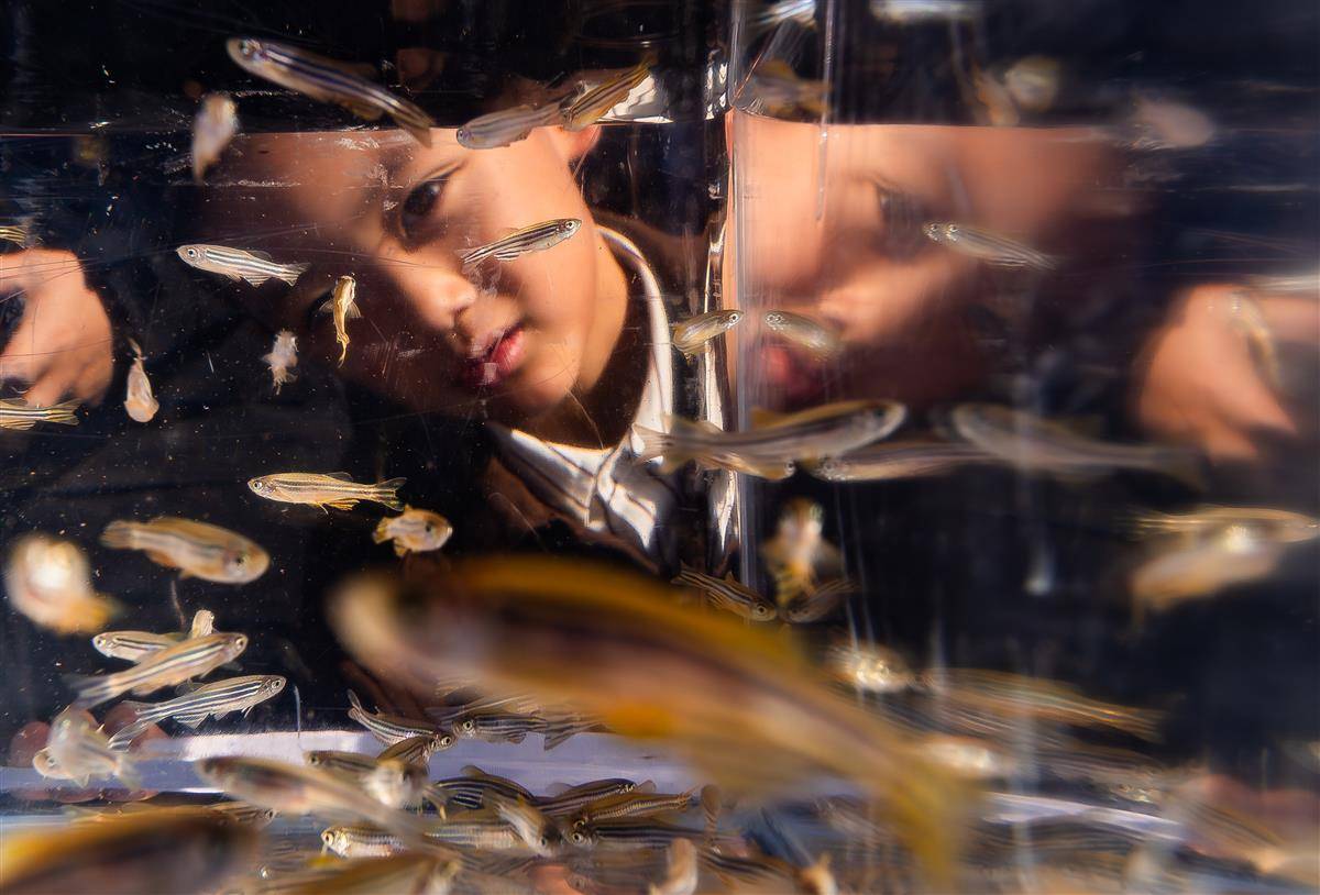 中国科学院水生生物研究所国家斑马鱼资源中心展位,小朋友透过鱼缸观察斑马鱼。