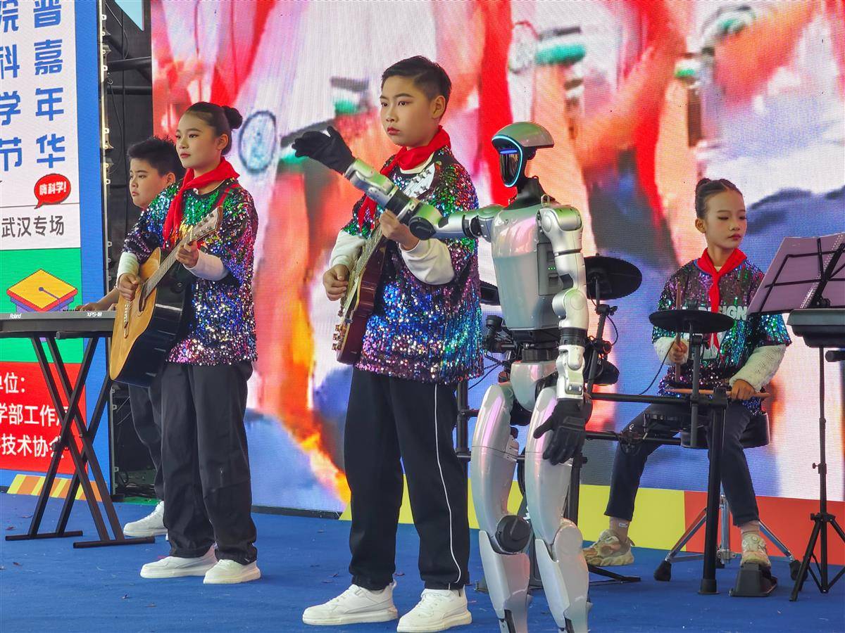 活动开幕现场,小朋友和人形机器人同台表演节目。