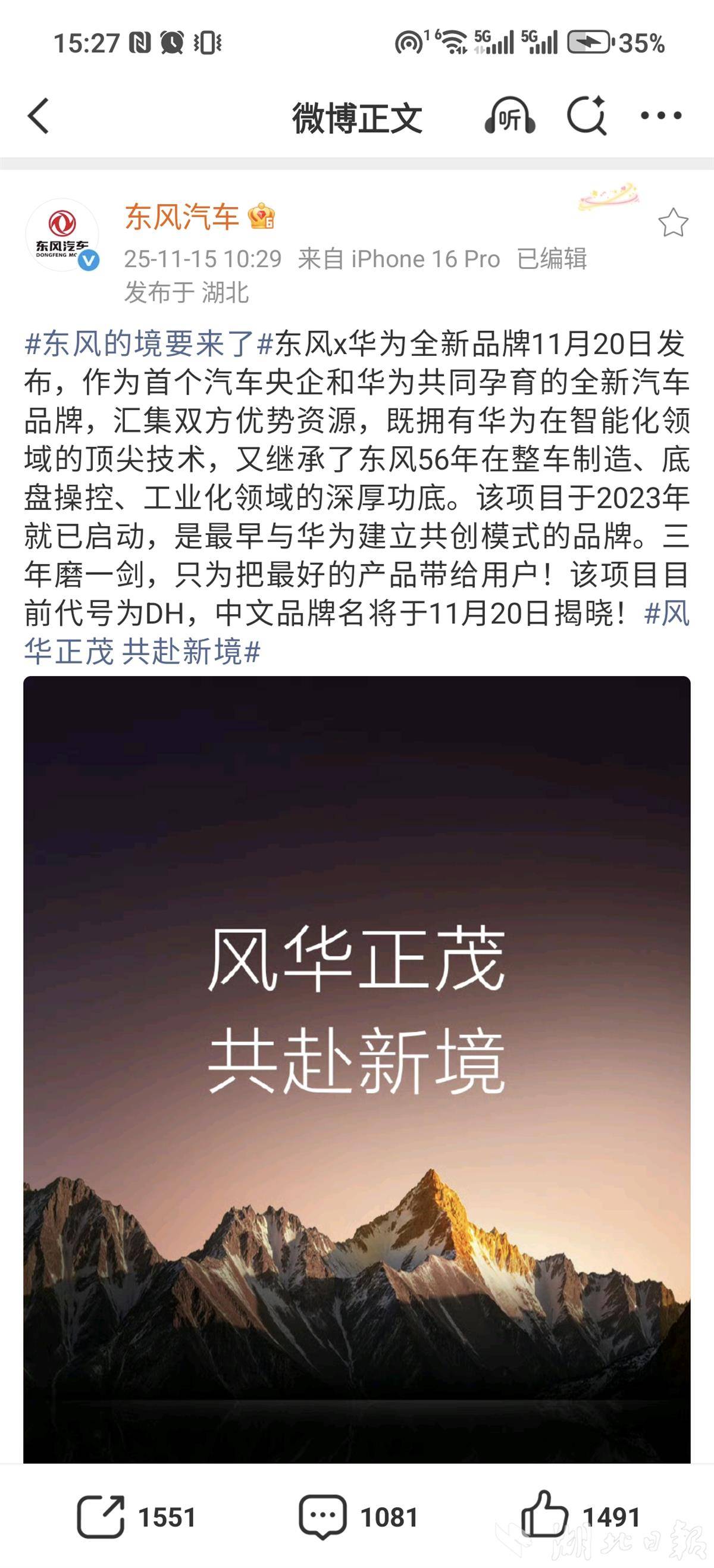 湖北日报讯(记者左晨、通讯员周丽琴)11月15日,东风汽车官方微博发布消息,东风与华为联手打造的全新品牌(DH项目)将于11月20日在华为乾崑生态大会正式发布,届时新品牌名称也将揭晓。据了解,DH项目产品会搭载最新的华为乾崑智能汽车解决方案,是双方技术融合度极高的智能车型之一。