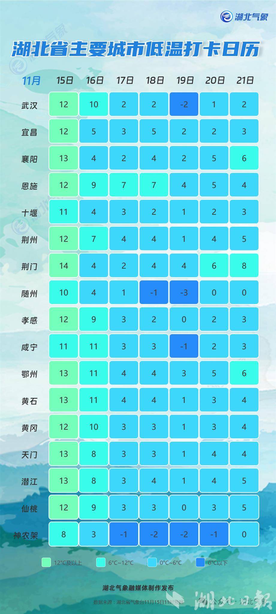 预计18日早晨湖北北部地区最低气温降至0℃,南部地区气温下滑至3至6℃,省内大部气温将创今年下半年来新低。气象部门提醒:此轮寒潮天气来势汹汹,需提前做好防范措施,雨雪天气将导致道路湿滑、结冰、能见度下降,出行注意交通安全。及时关注气温变化,添加衣物,以免着凉。