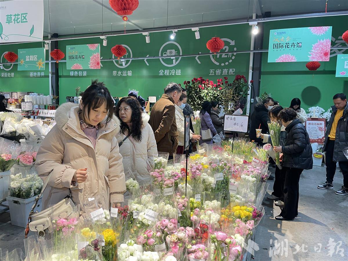 从鄂州花湖国际机场转运来的鲜花抵达汉口北鲜花小镇。图为市民采购鲜花。湖北日报全媒记者 刘天纵 摄