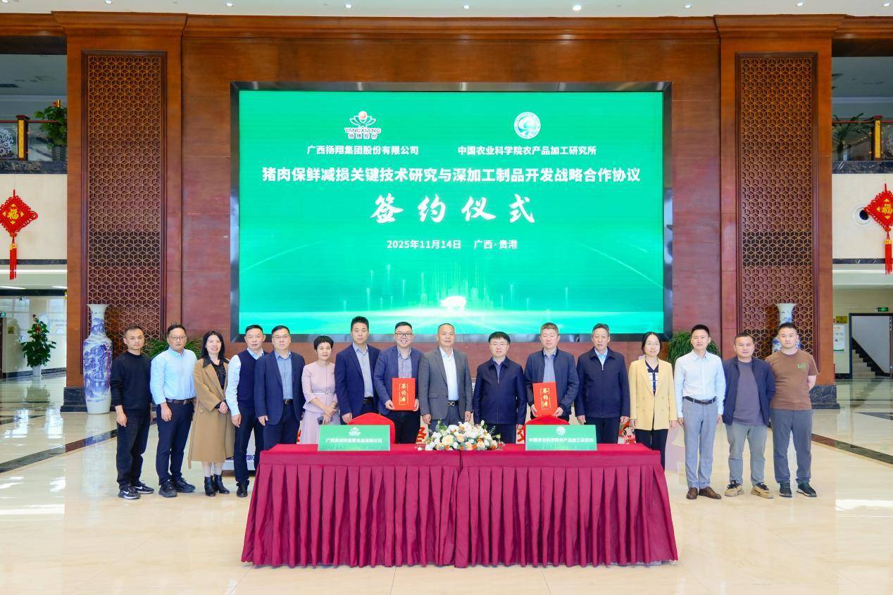 11月14日,扬翔集团旗下现代化食品企业广西贵港市盈康食品有限公司与中国农业科学院农产品加工研究所正式签署“猪肉保鲜减损关键技术研究与深加工制品开发”战略合作协议,并召开专项项目交流会。此次合作标志着盈康食品在科技赋能猪肉产业升级的道路上迈出里程碑式一步,将依托顶尖科研力量破解行业痛点,为消费者带来更新鲜、更健康、更多元的猪肉产品。