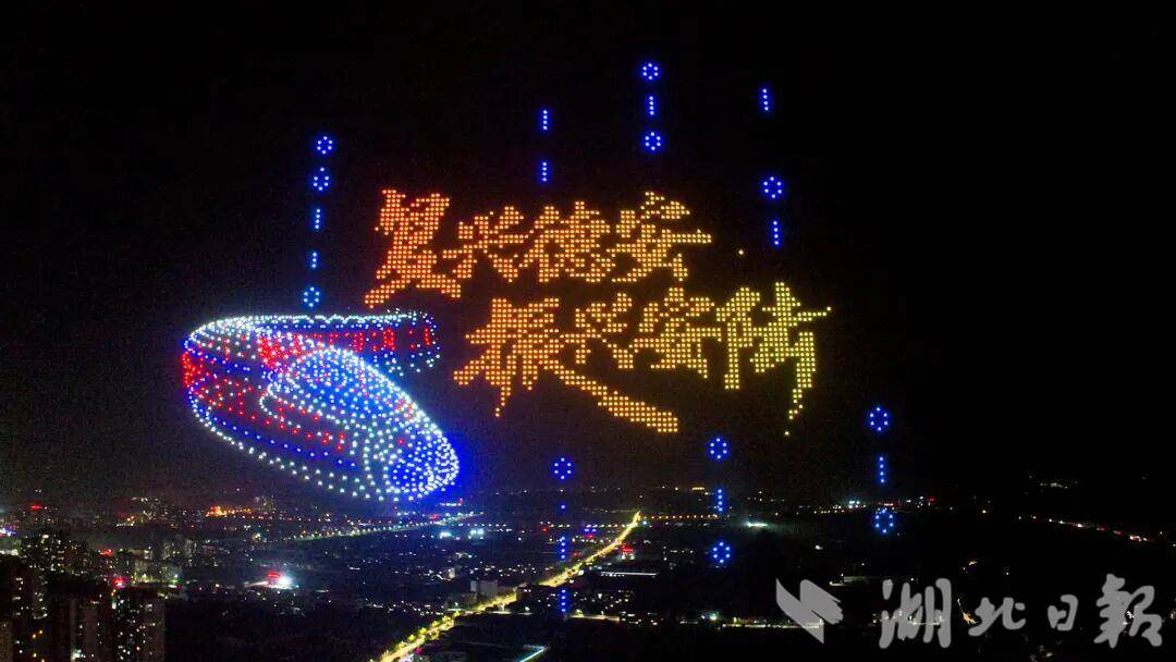 开幕式上,李白数字人全球首发,这位跨越千年的“诗仙”以全新数字形态生动亮相,向世界推介安陆的山水人文。无人机划破夜空,勾勒出白衣诗仙的身影。一场由3000架无人机编队演绎的天幕秀点亮夜空,明月出涢水、诗仙泛舟、长卷挥毫、月中舞剑、安陆乡超、钱冲银杏等画面次第浮现,最终汇成“复兴德安 振兴安陆”的鎏金字样。