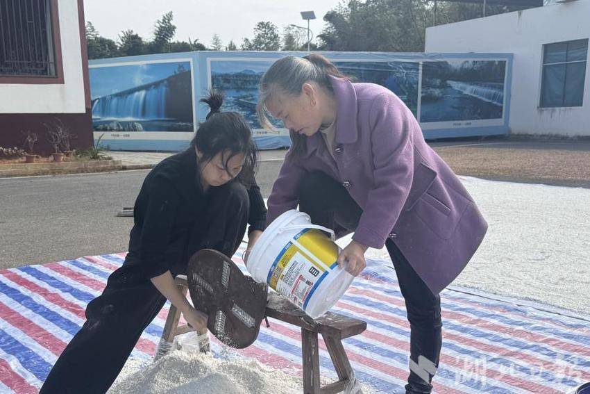 “晒场就是村民的‘丰收后盾’!这里场地宽敞、光照充足。我们村干部也会搭把手,遇到天气变化还会提前通知村民收粮。”村干部朱琴红一边帮着搬运薯粉,一边介绍。