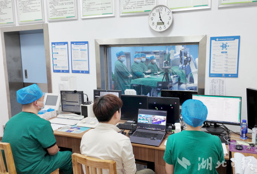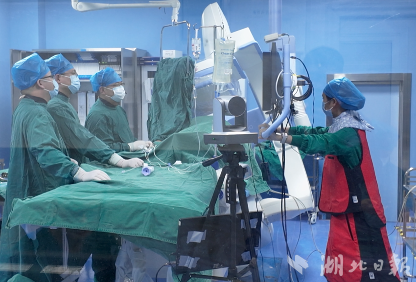 在崇阳县中医院心脏介入中心手术室内,该院心内科骨干团队正在为患者实施血管内超声指导下冠状动脉内支架植入术。专家团队通过线上平台对手术全过程进行了实时观摩、讨论和指导。不到一小时,手术圆满成功。