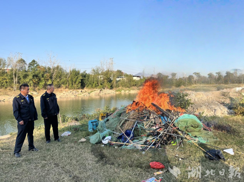 湖北日报客户端讯(通讯员陈琳)近日,崇阳县农业综合执法大队联合青山镇综合执法中心开展非法捕捞渔具集中销毁行动,现场销毁一批违规禁用渔具,以实际行动守护崇阳县水域生态环境。