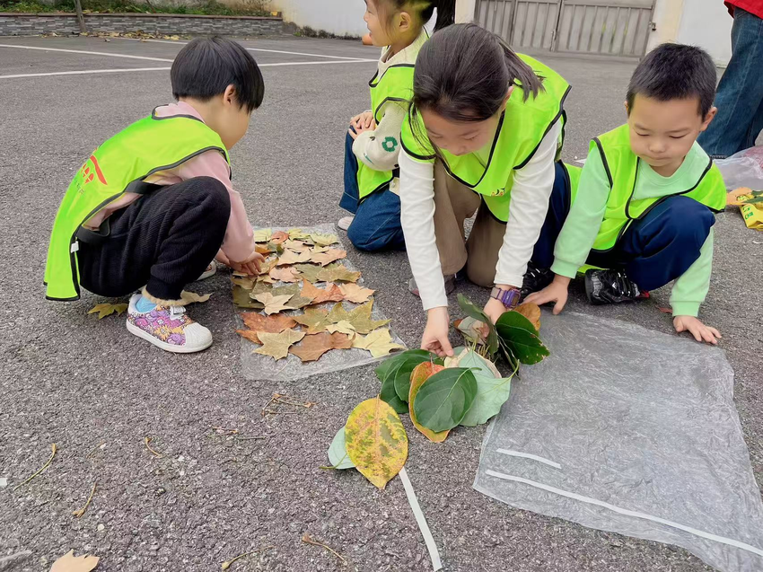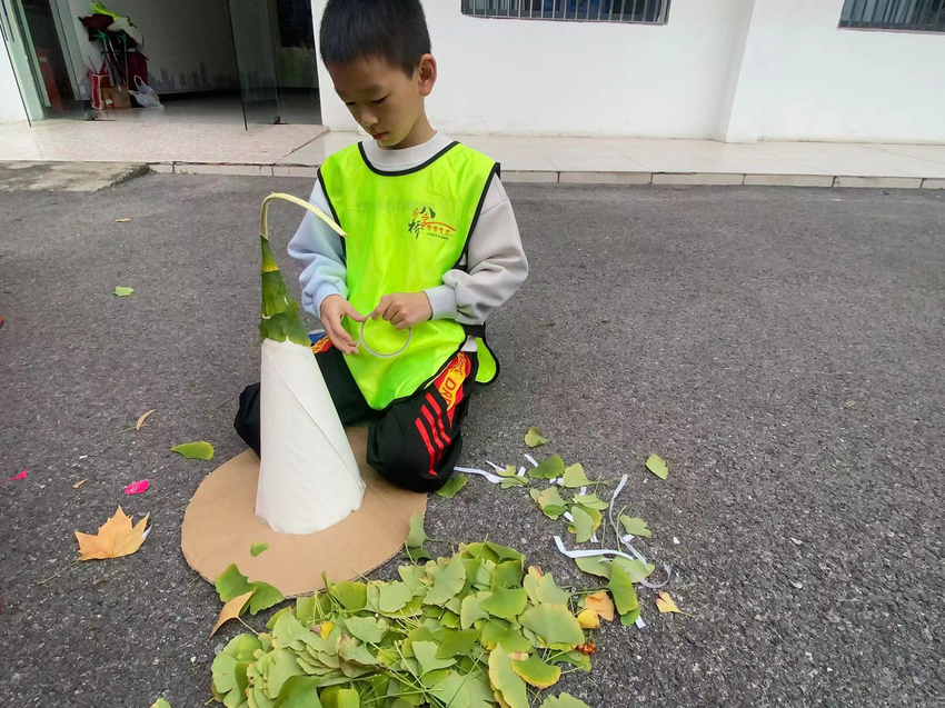 微风轻拂间草木清香扑鼻,孩子们化身“自然观察员”,弯腰拾起金黄的银杏叶、火红的枫叶、深绿的香樟叶……每一片落叶都成了大自然馈赠的创意素材。大家带来的快递盒、鞋盒经清理后,也摇身变为手工的“基础框架”,焕发新生。