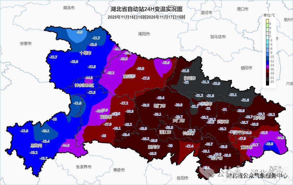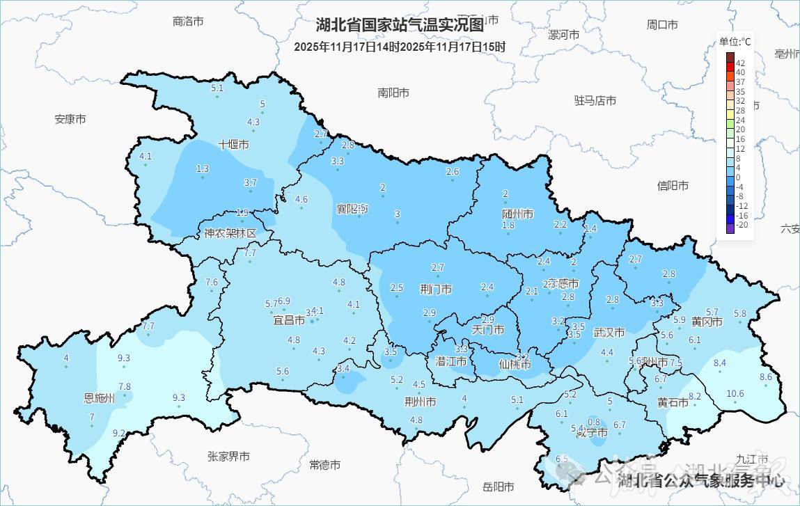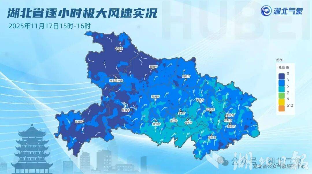除了风,还有速冻模式。以武汉为例,17日早晨是白天最热的时候,凌晨一点气温在17.9℃,白天气温持续下跌,下午三点降至3.9℃。从全省来看,气温也下降剧烈,15时全省气温都仅有个位数,较16日白天同一时次普遍下降10℃以上,其中中东部地区降温15℃至20℃,北部部分地区降温20℃以上。
