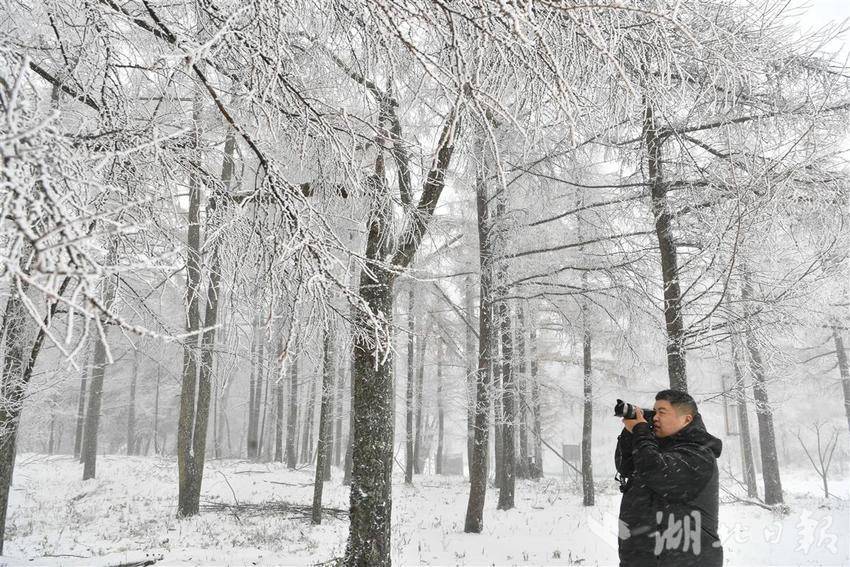 11月17日,一名摄影爱好者在保康县龙坪镇大水林场拍摄雪景。