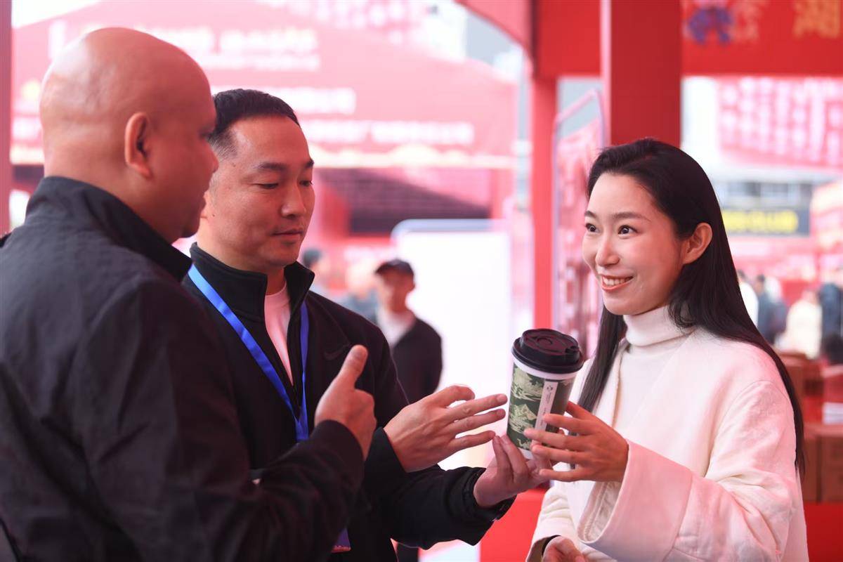 2025赤壁青砖茶产业大会,“90后”创业者雷寒峰(右一)推介青砖茶爆款奶茶。(湖北日报通讯员陈红菊摄)