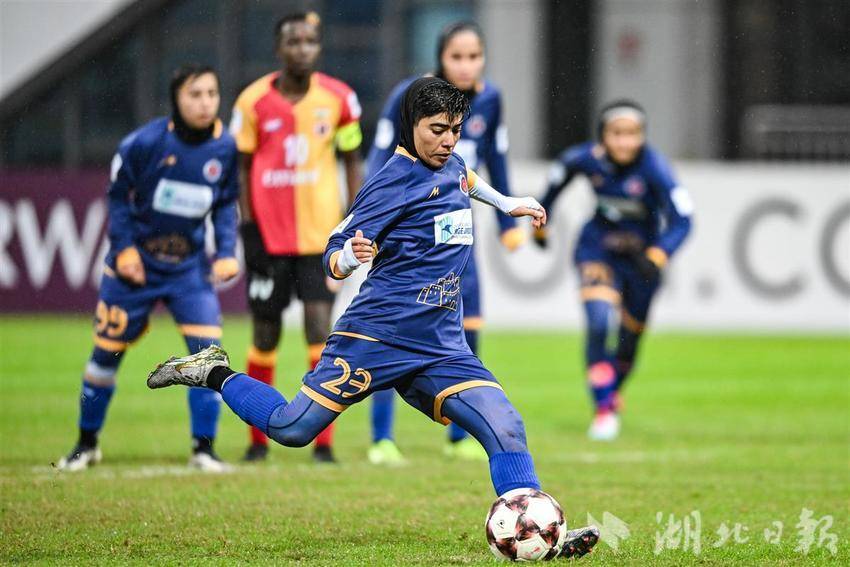 11月17日下午,巴姆卡通女足(伊朗)队员哈穆迪在比赛中罚射点球。(湖北日报全媒记者 任勇 摄)