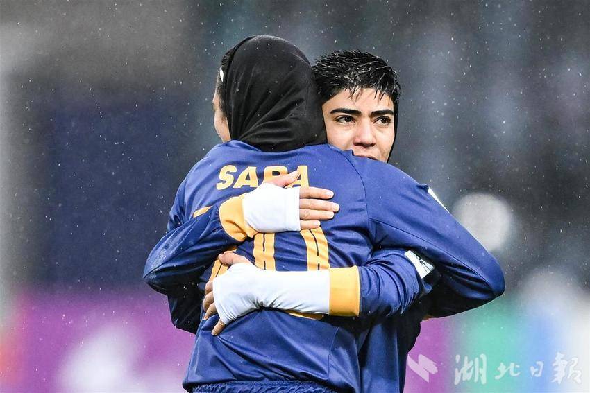 11月17日下午,巴姆卡通女足(伊朗)队员哈穆迪罚进点球后与队友拥抱庆祝。(湖北日报全媒记者 任勇 摄)